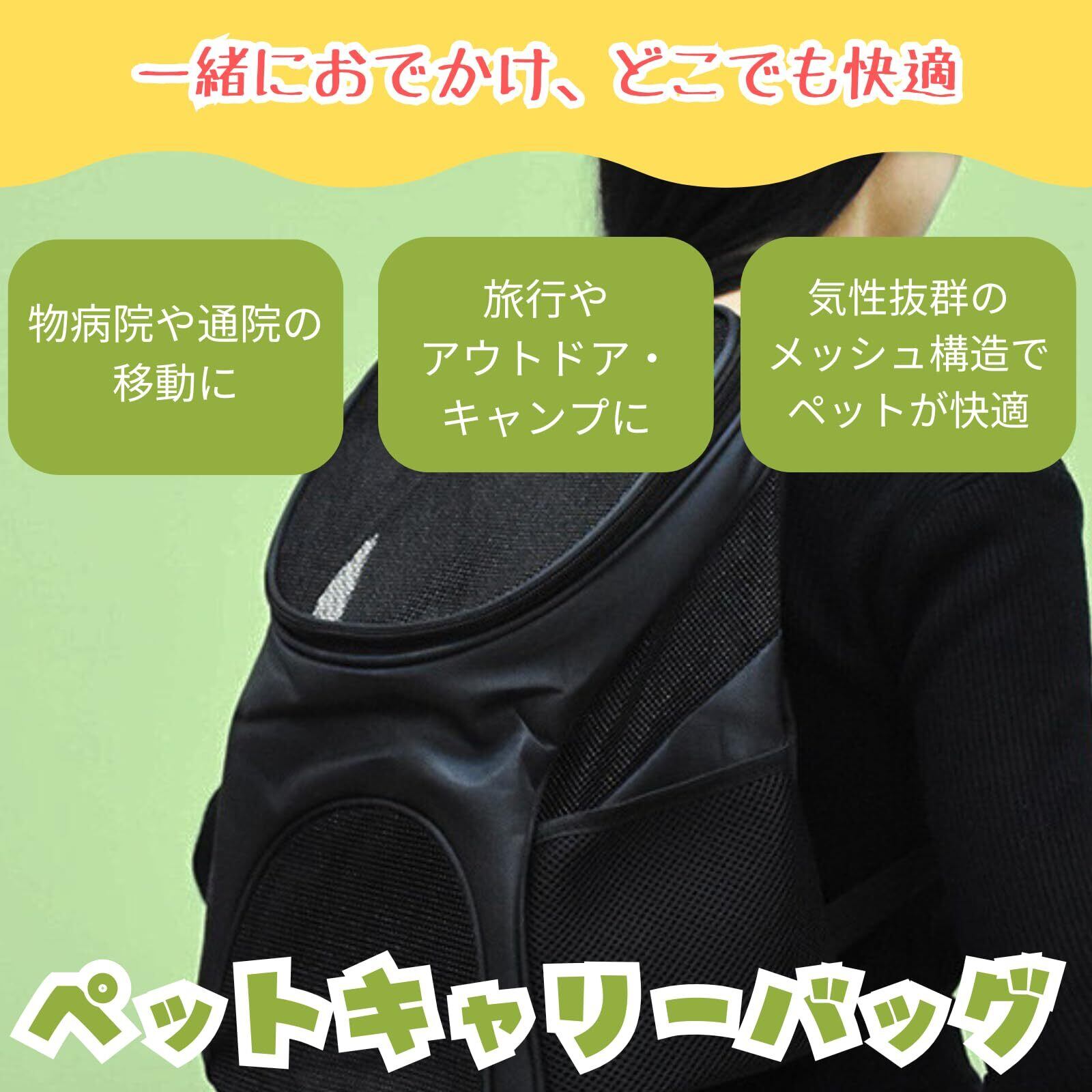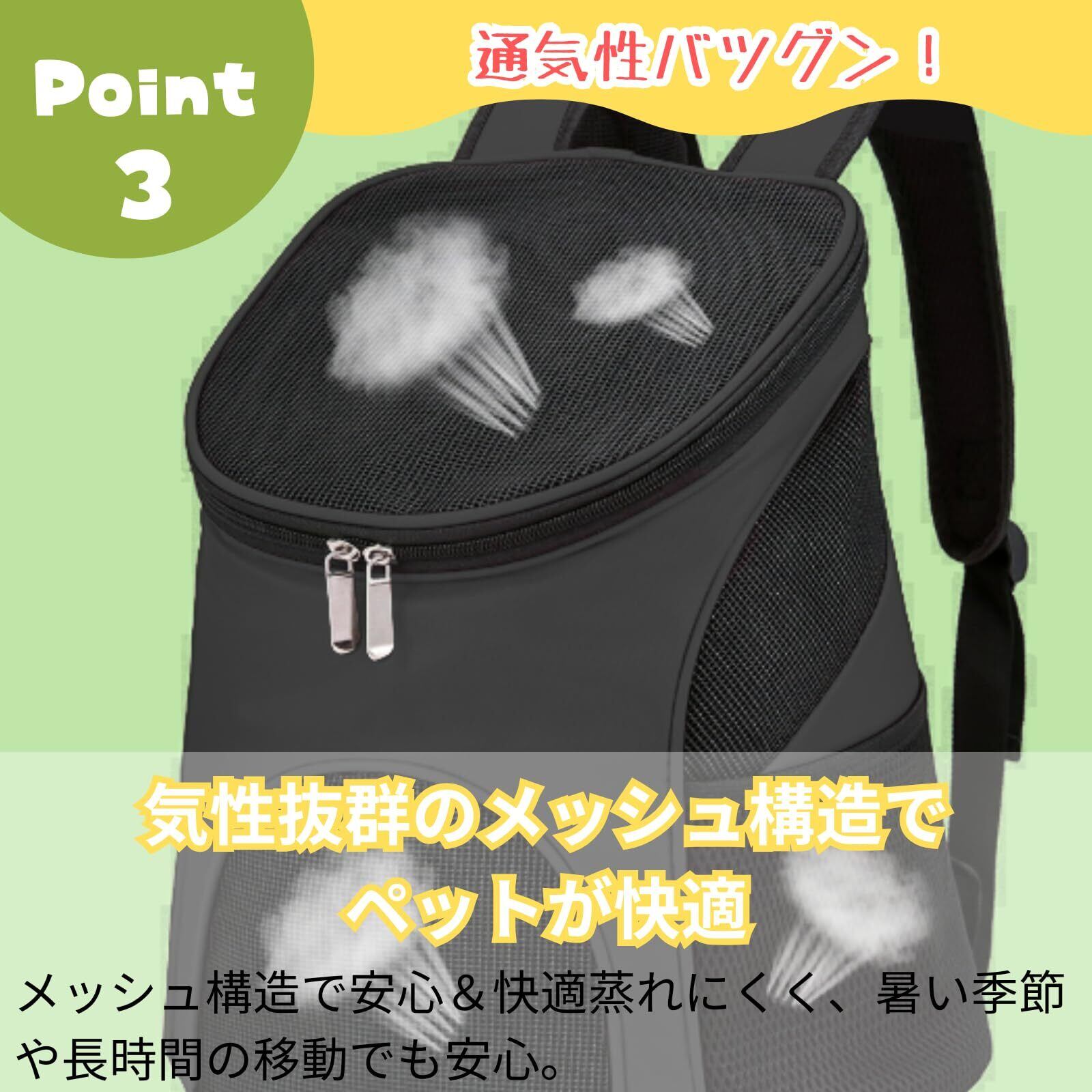 【通気性抜群のメッシュ構造でペットが快適】メッシュ構造で通気性が良く、長時間の移動でもムレにくい設計。軽量かつ耐久性の高い素材を採用し、ペットが快適に過ごせる空間を確保しました。肩や背中への負担を軽減するクッション付きショルダーベルトと、収納力抜群のポケット付きで、飼い主にも優しいデザイン。