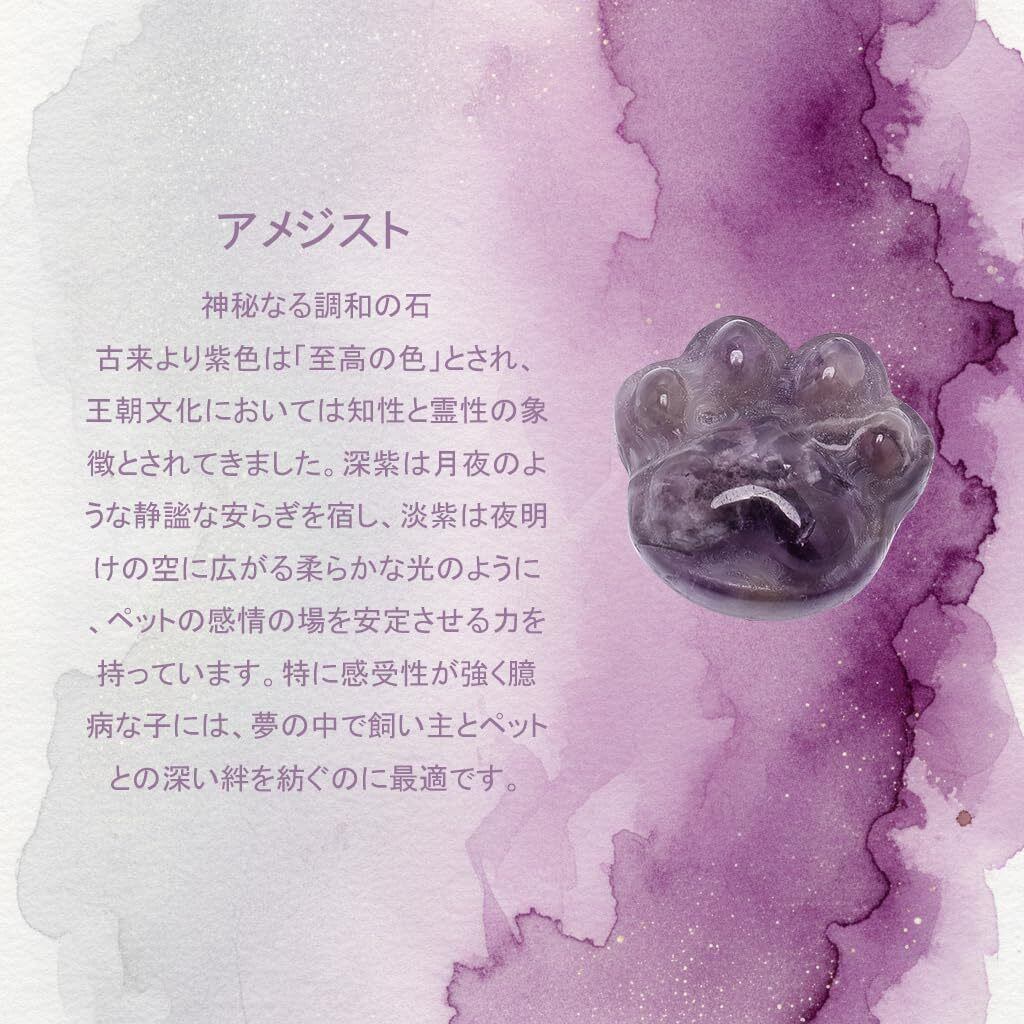神秘なる調和の石 - 紫水晶 王朝文化で尊ばれた至高の色、紫色が宿る水晶です。深い安らぎと調和のエネルギーを放ち、感受性が強く臆病な子の感情を落ち着け、飼い主様との深い絆を育みます。