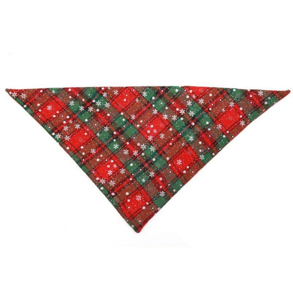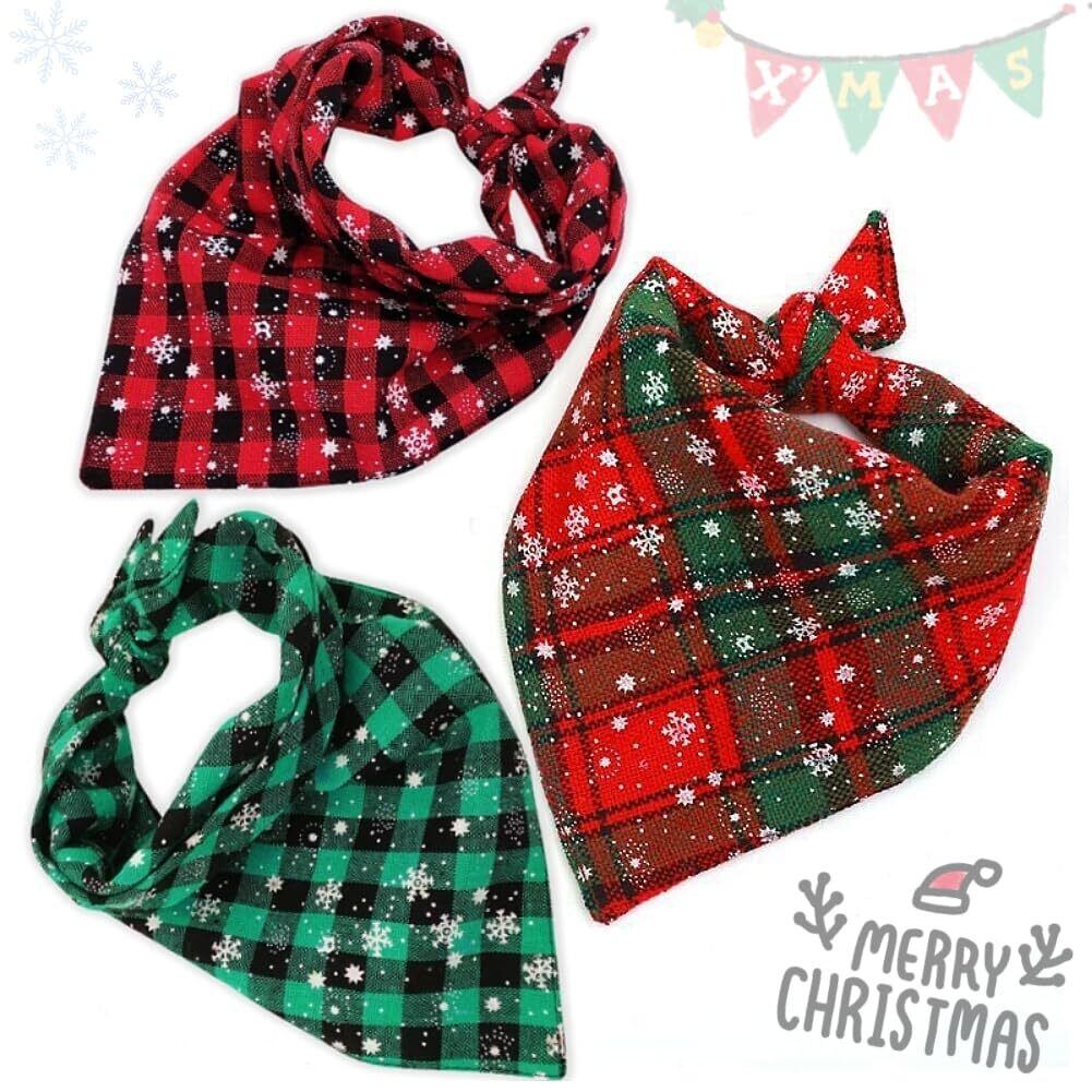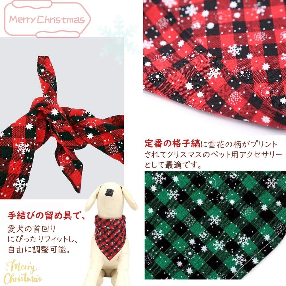 【クリスマス雰囲気アップ】:定番の格子縞のバンダナに可愛いクリスマスの絵柄がプリントされています。赤と緑の色がオシャレで、クリスマスのペット用アクセサリーとして最適です。明るい色と豊かな模様のネックスカーフをつけて公園を散歩すれば、ペットがとてもキュートに見え、注目を集めること間違いなしです。