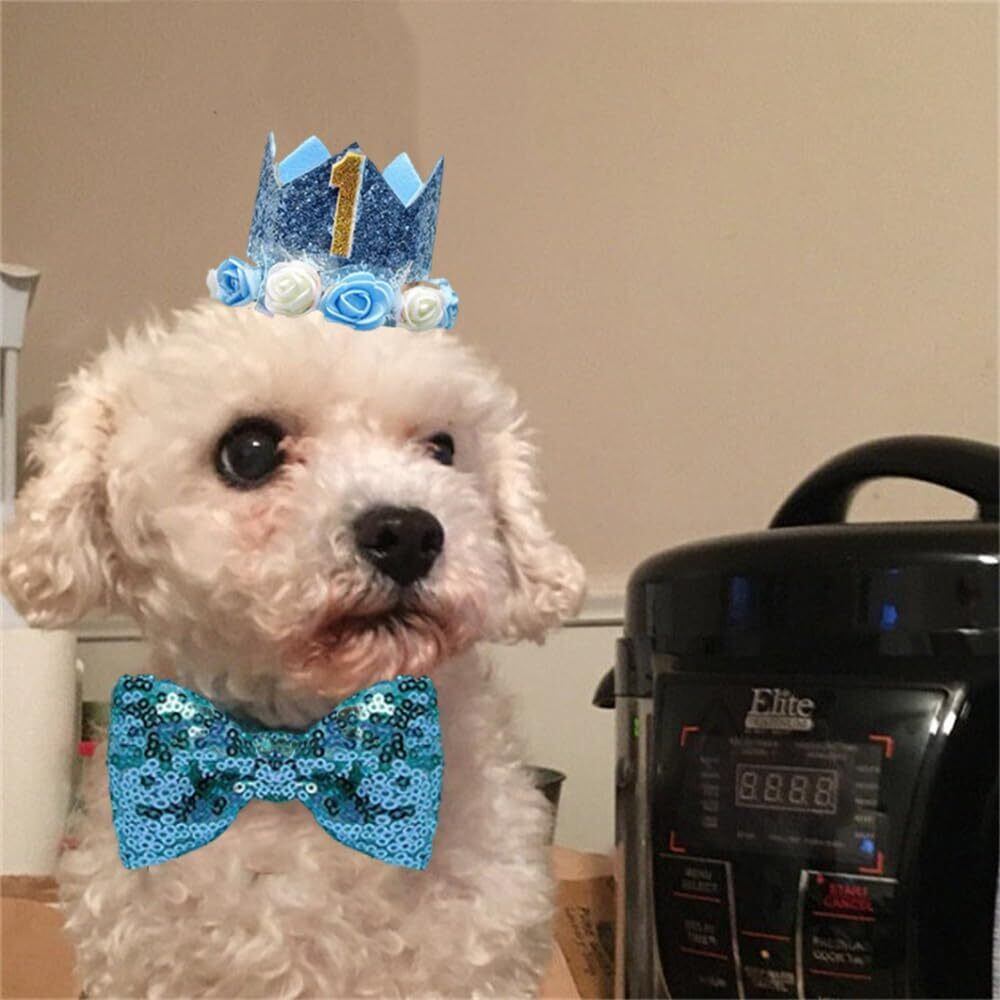 YBGGJO ペット用 バースデー帽子 3点セット 犬 猫用 蝶ネクタイ 王冠 数字付き 飾り付け 記念日 誕生日 パーティー飾り (ブルー)