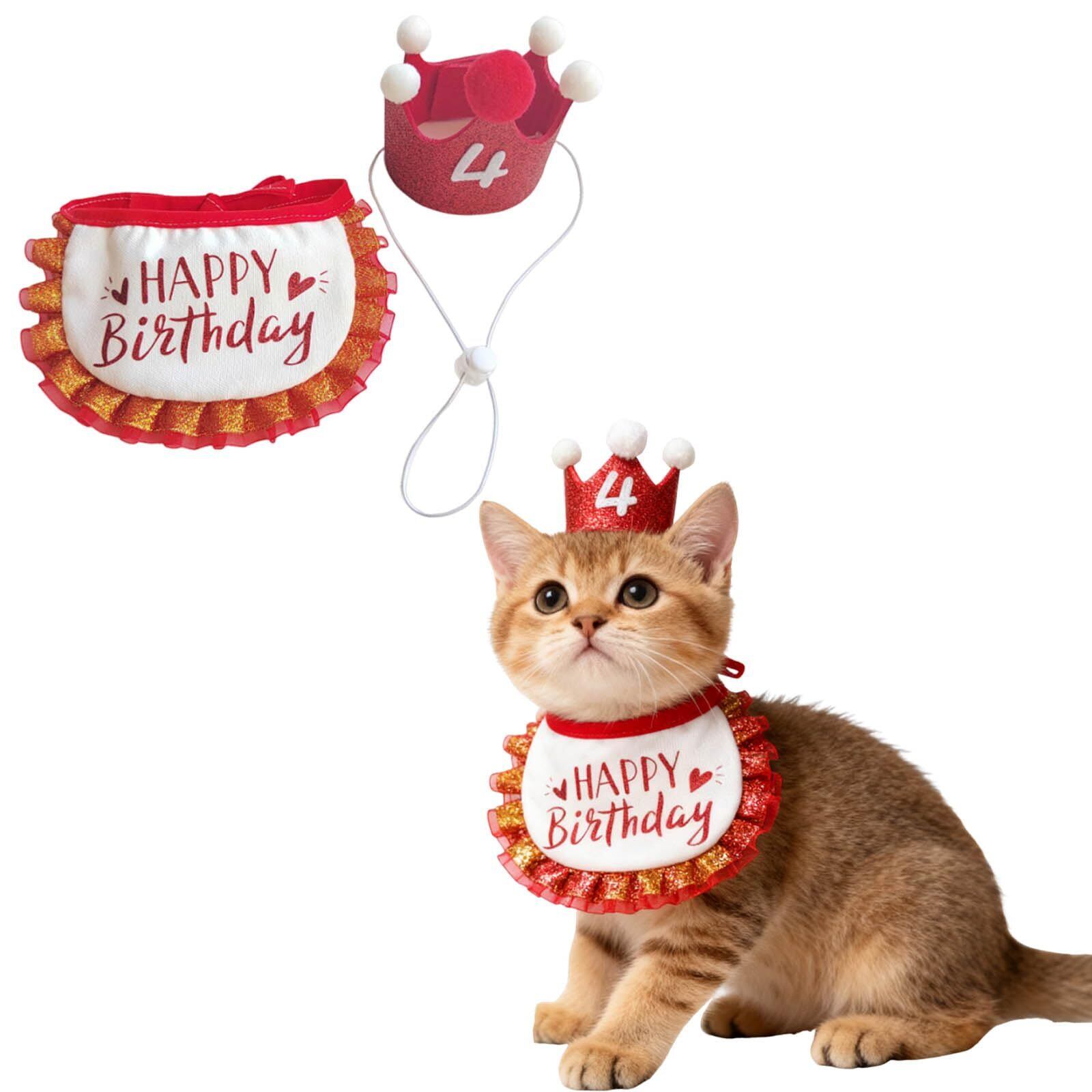 CHANJIF 猫 犬 誕生日 帽子 3点セット おしゃれ Happy Birthday スタイ 被り物 数字付き スタイ 唾液タオル ペット 飾り プレゼント バースデーグッズ ハットペット用 写真撮影(赤)