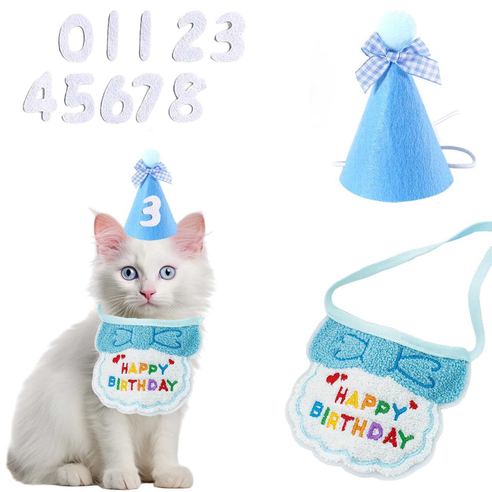 DEVENTORZ ペット用誕生日帽子 帽子 犬 誕生日 帽子 犬 猫用 誕生日グッズ 誕生日グッズ 3点セット バースデー帽子 数字付き 記念日 写真撮影飾 り付け ペット 三角帽子 唾液タオル (ブルー)