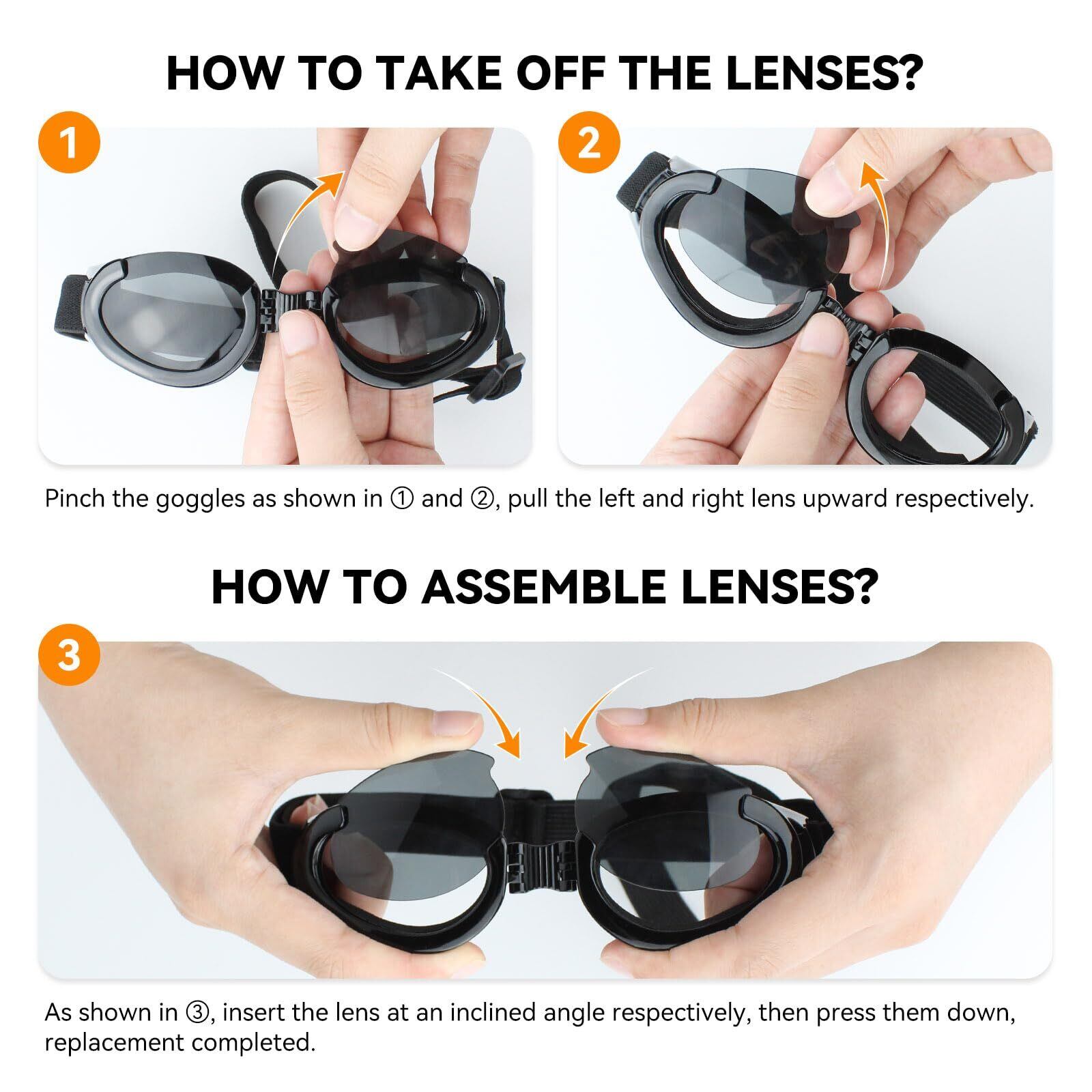交換可能なレンズ: 黒レンズと透明レンズをご用意。晴れた日に紫外線から保護する黒レンズ。敏感な目や目の手術を受けた子犬に強くお勧めします。