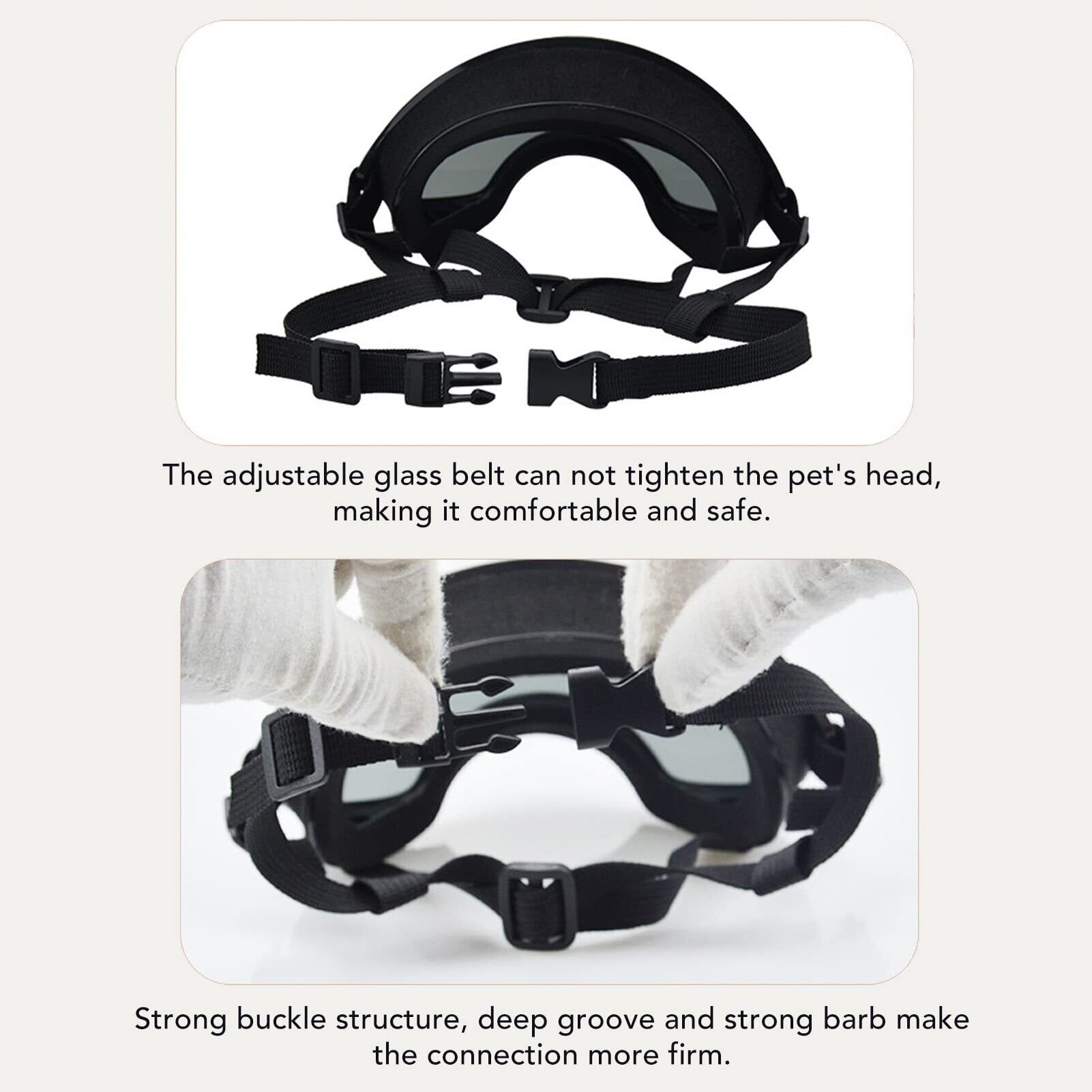強力なバックル構造による確実な接続:強力なバックル構造、深い溝、頑丈なバーブデザインにより、犬用ゴーグルの安全な接続をします。ペットの目の保護は当社の最優先事項であり、しっかりとした接続は当社の取り組みを反映しています。