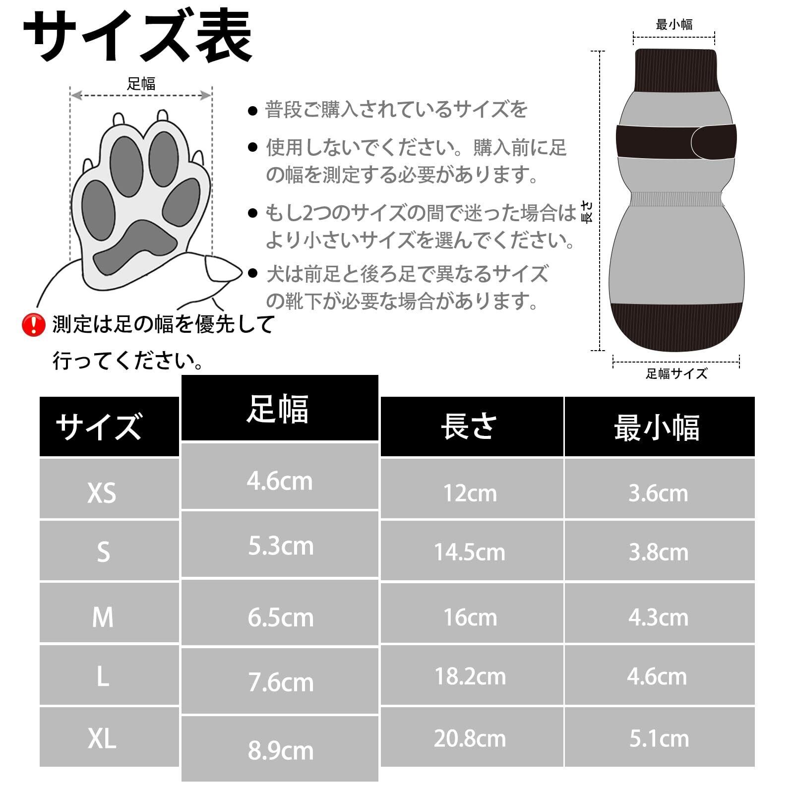 【サイズ】:「XS:足幅:4.6cm長さ:12cm最小幅:3.6cm」「S:足幅:5.3cm長さ:14.5cm最小幅:3.8cm」「M:足幅:6.5cm長さ:16cm最小幅:4.3cm」「L:足幅:7.6cm長さ:18.2cm最小幅:4.6cm」「XL:足幅:8.9cm長さ:20.8cm最小幅:5.1cm」 ※ご注意:ご購入前に愛犬の足のサイズをしっかり測定してください。もし愛犬のサイズが2つのサイズの中間にある場合は、小さい方のサイズをお選びいただくことをおすすめします。靴下はぴったりとフィットするように設計されています。