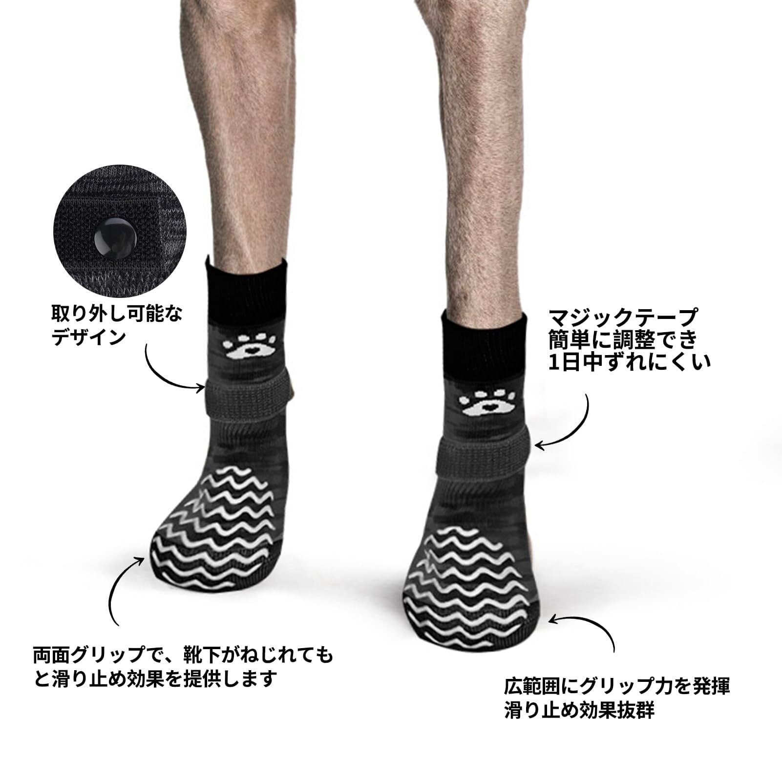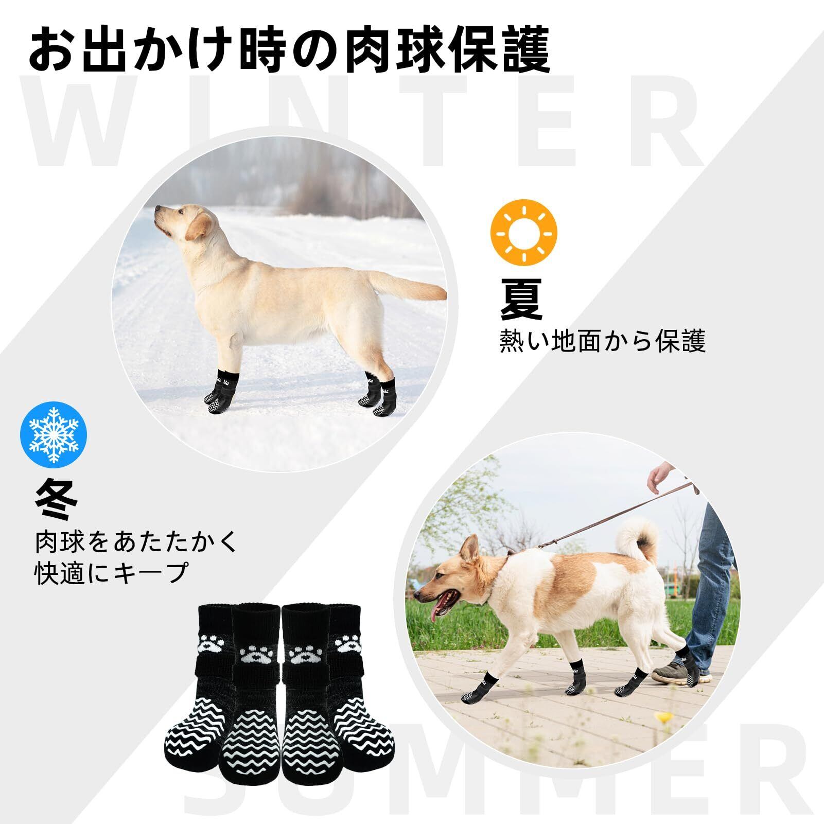 【オールシーズン活躍】:室内外でさまざまな用途に対応できます。犬が滑って家具を傷つけるのを防ぎ、傷を舐めるのを防止します。また、荒れた地面から足を守り、冬の寒さから温かく保ち、夏の暑い地面からも足を守ります。季節を問わず使用できる、便利な靴下です。