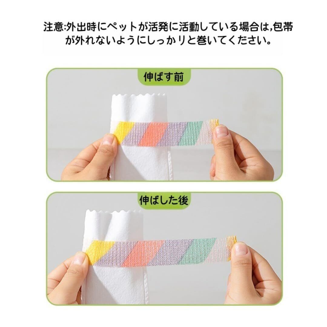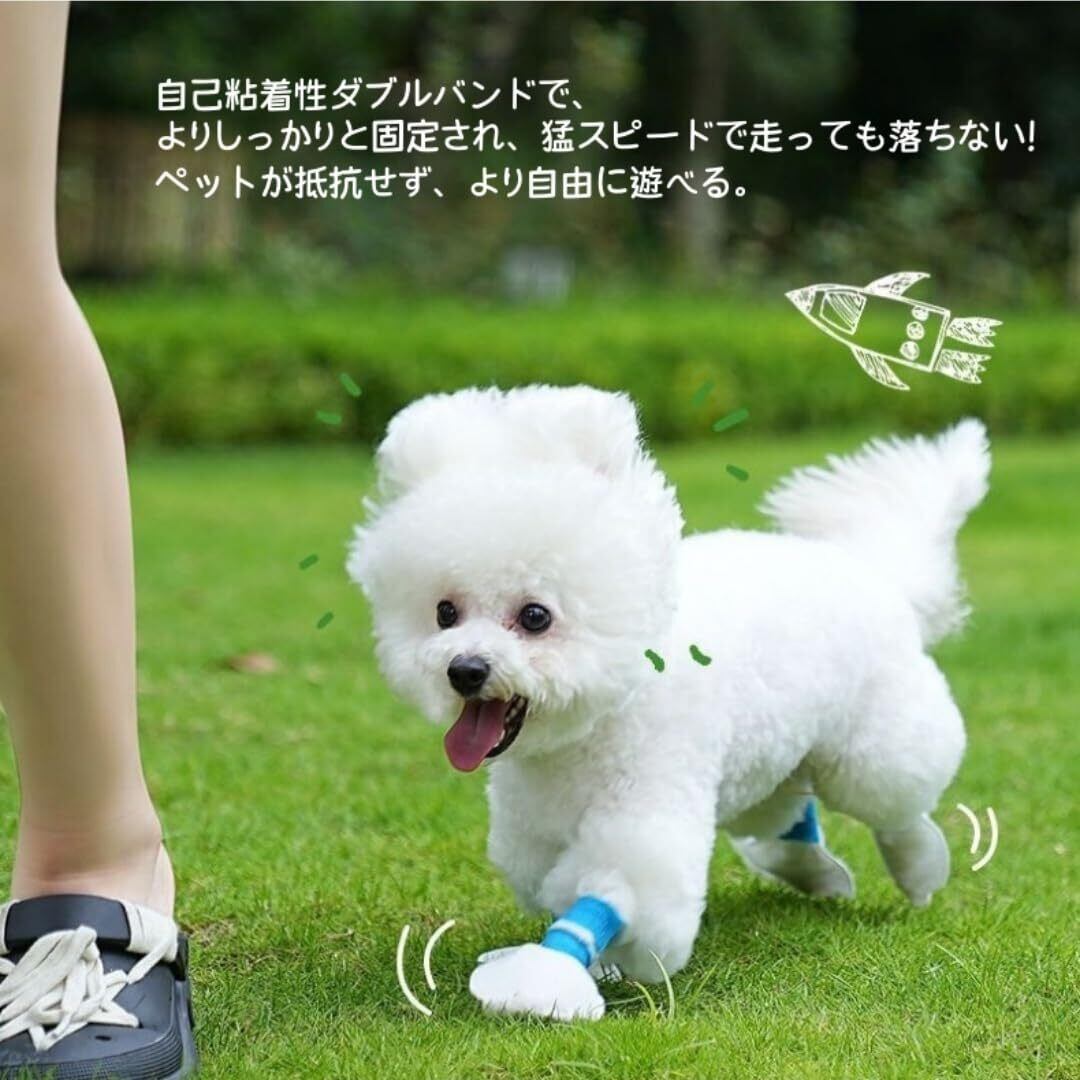 結束テープ固定: シューズカバーを履かせ、伸縮性ある結束テープで固定するだけ。ペットの足のサイズに合わせて締め付け具合を調整でき、ペットにストレスを与えません。激しい動きでも脱げしないため、テープで上下2段に巻いてください。