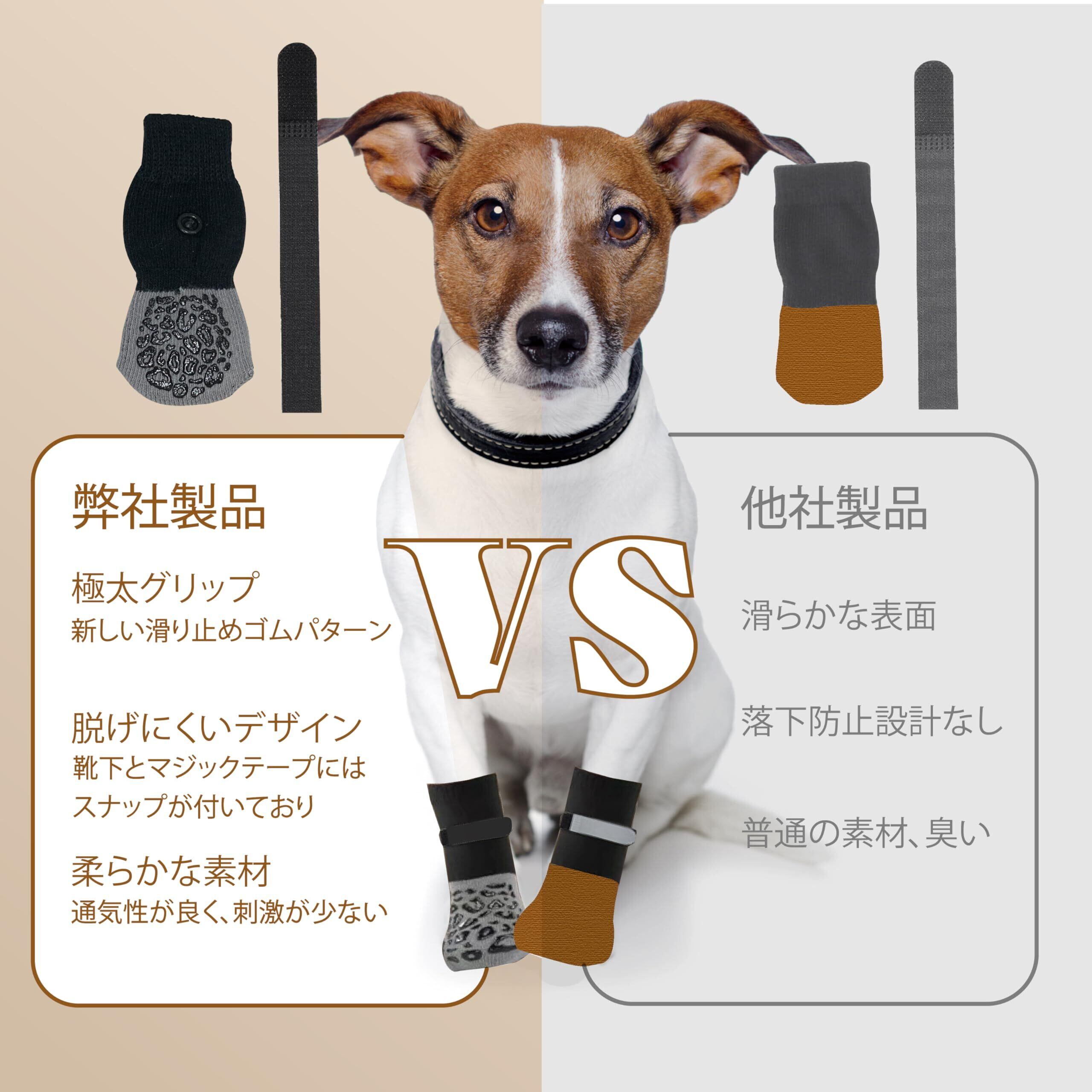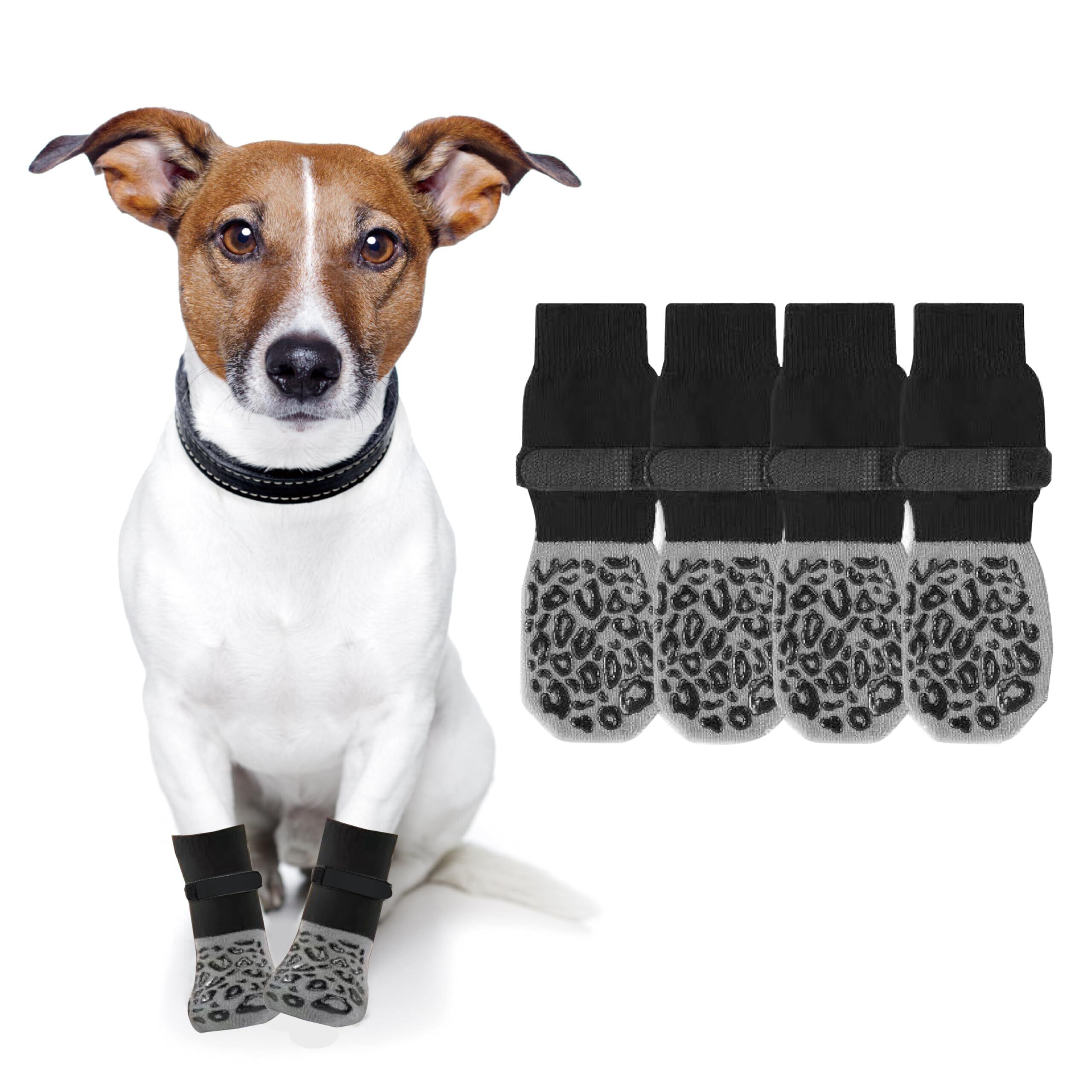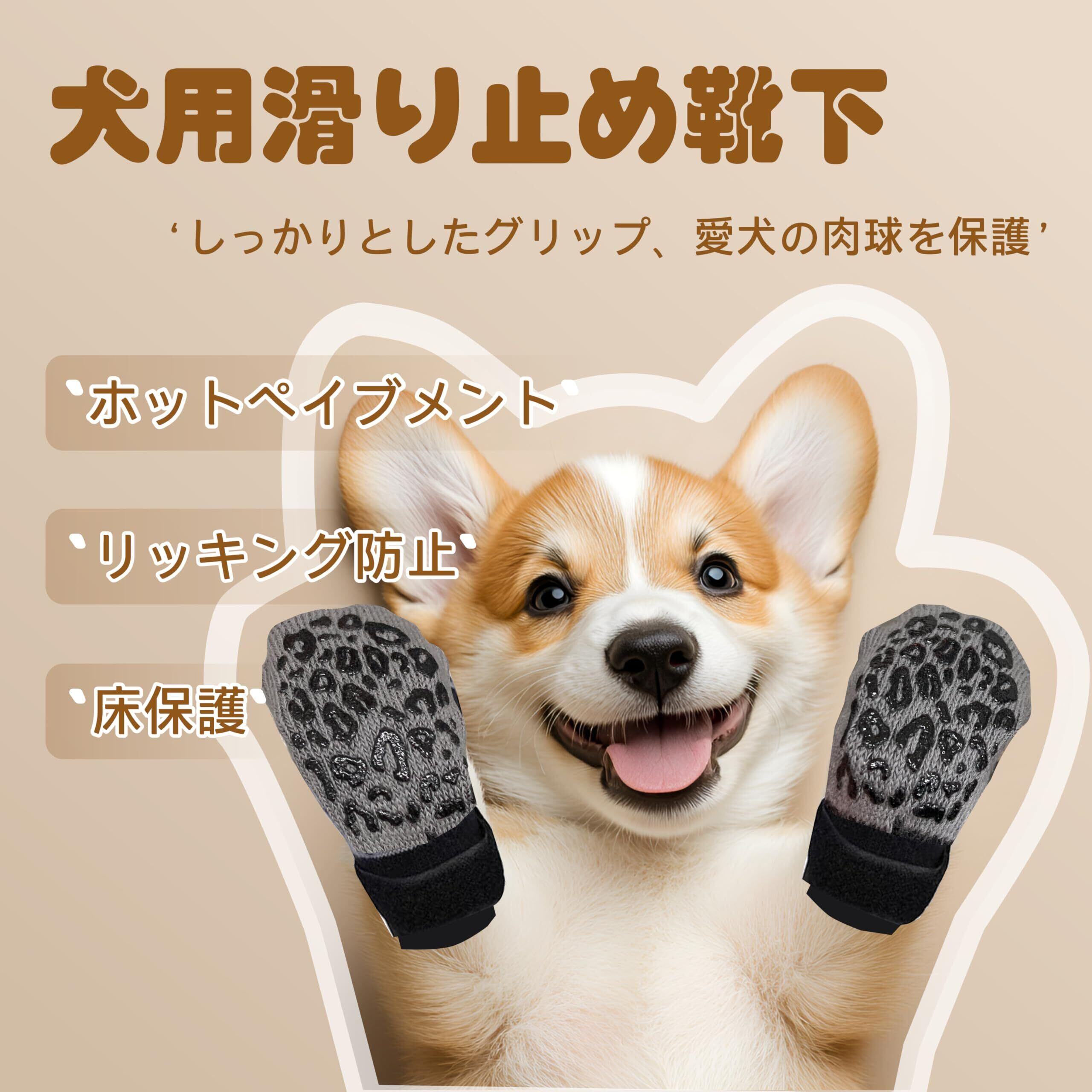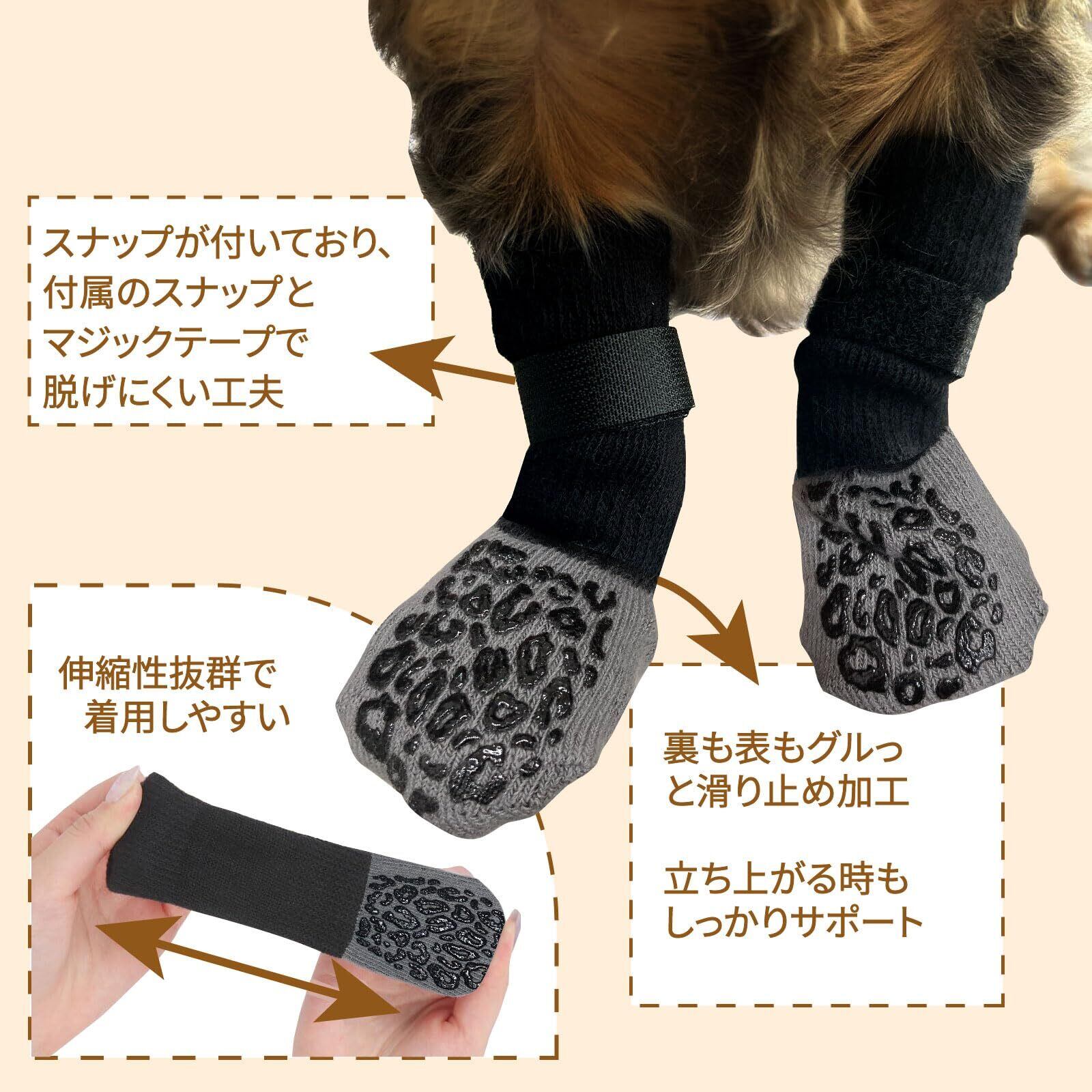 KUERUE 犬 滑り止め靴下 脱げにくい マジックテープ付き 柔らかな 通気性に優れ 伸縮性ある 介護 舐め防止 犬用靴 足カバー ペット肉球保護 足音軽減 (S, 黒、ヒョウ柄)