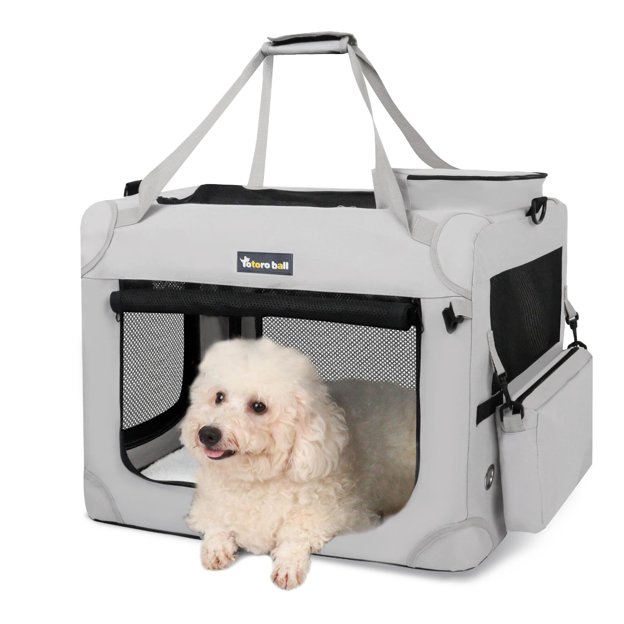 Totoro ball 犬用キャリーバッグ ソフトクレート 犬 キャリーケース 中型犬 犬用クレート 折りたたみ 犬 車用ケージ 5面メッシュ ロック付き 給水ボトルバンド付き 中小型犬・猫2匹 10kgまで『車載、旅行、避難、アウトドア、帰省で活用!』 (ライトグレー, M(60L x 42W x 42H cm))