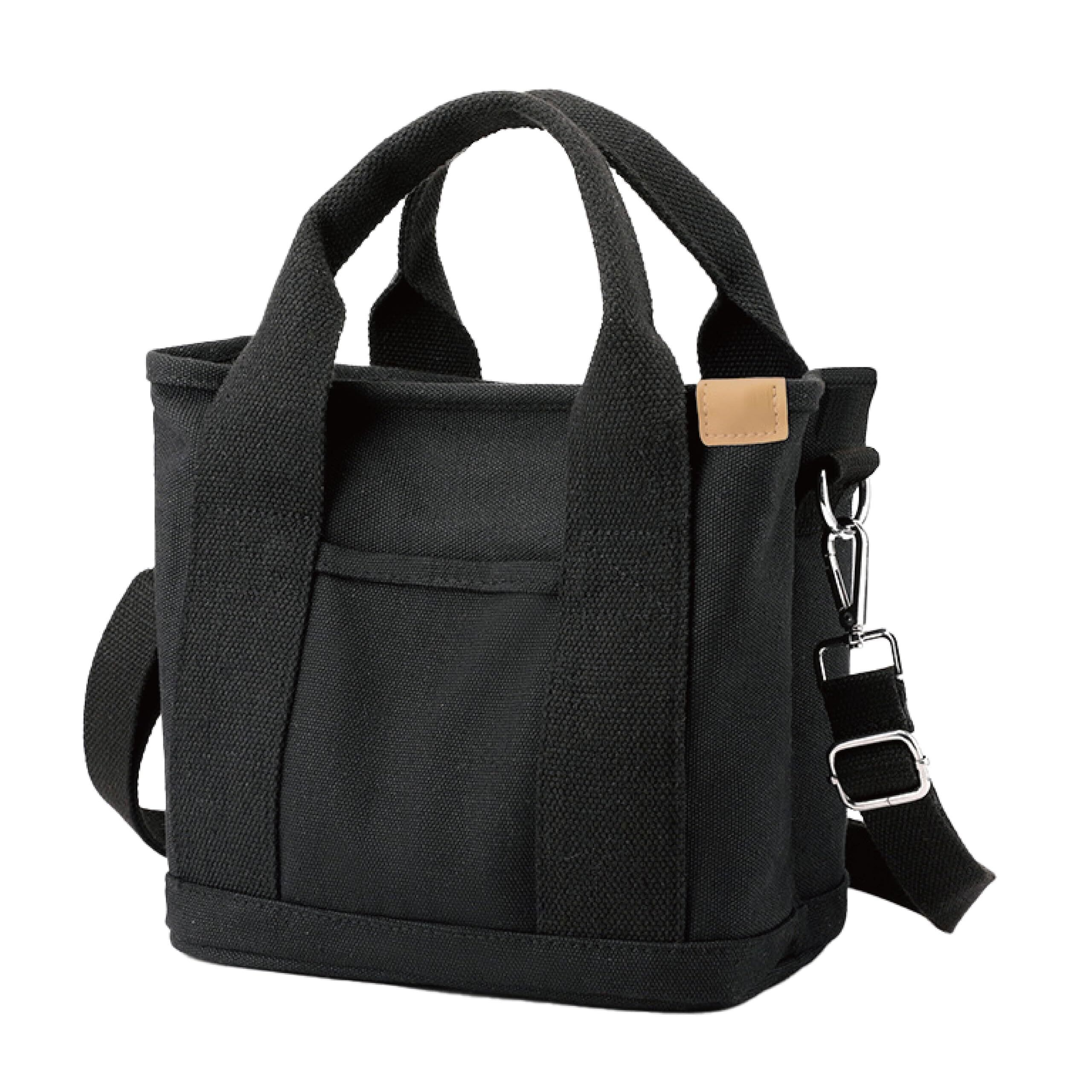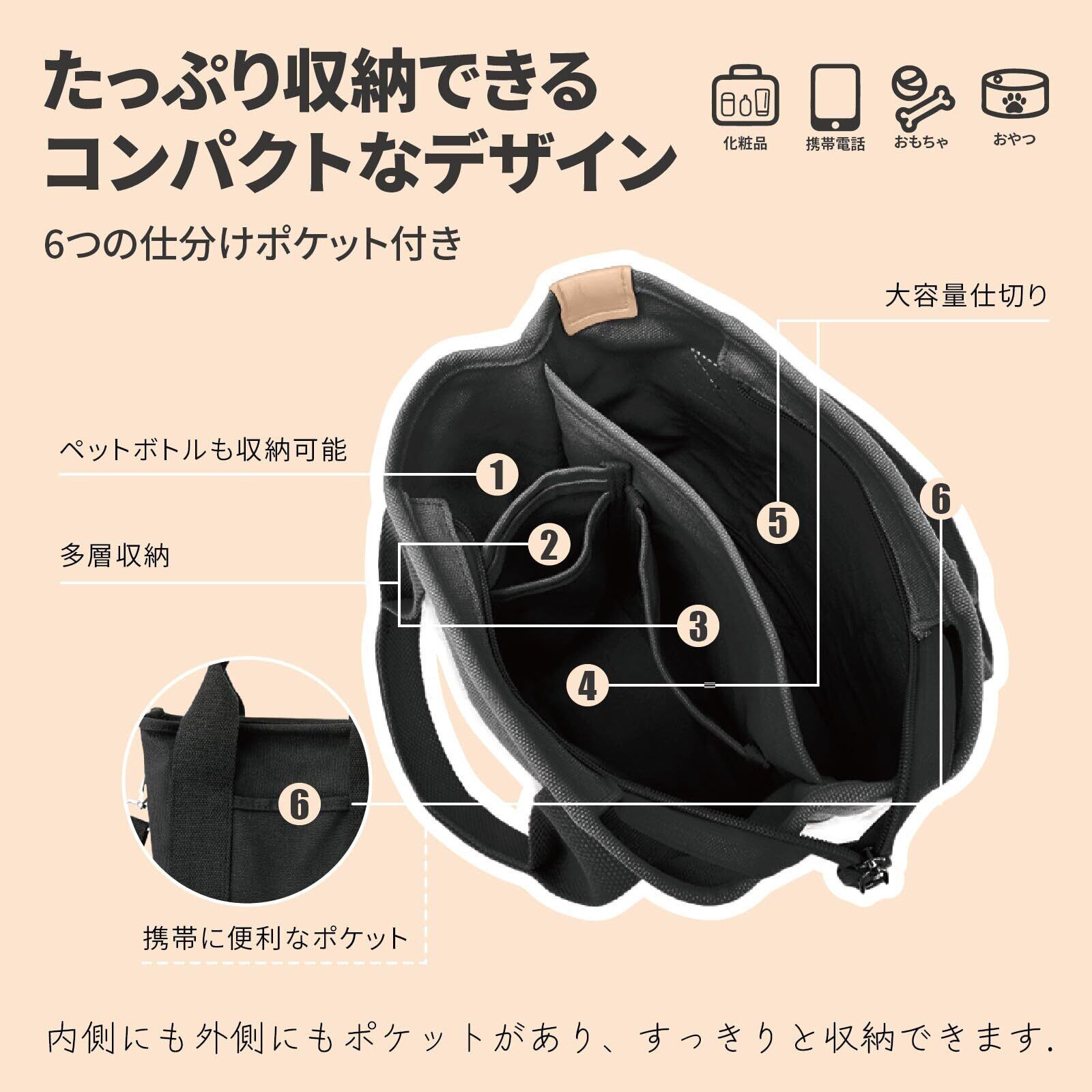 KUERUE お散歩バッグ 犬用 2way ショルダー ペットボトル仕切り付き コンパクト 肩ひも付き おでかけ 底板付き キャンバス コンパクト バッグ トート(ブラック)