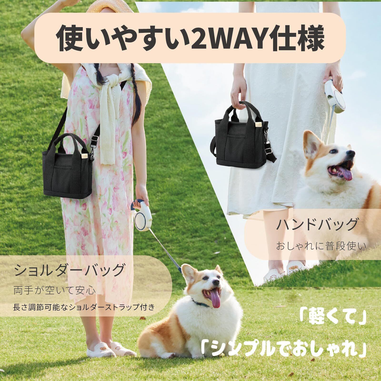 【2WAY仕様】調整可能なショルダーストラップ付きで、手提げバッグとしても、ショルダーバッグや斜め掛けバッグとしても使用できます。ワンちゃんのお世話がより快適になります。