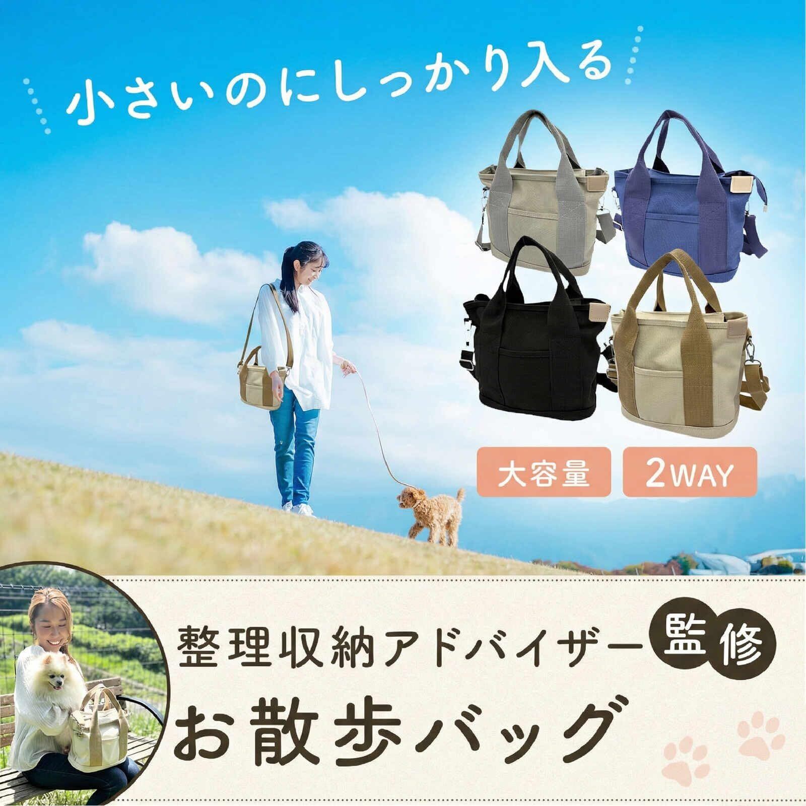 【ちょうどいいサイズのお散歩バッグ】 軽くてコンパクトなのに、必要な物はしっかり入る!毎日のお出かけに使いやすく、見た目もスマートです。
