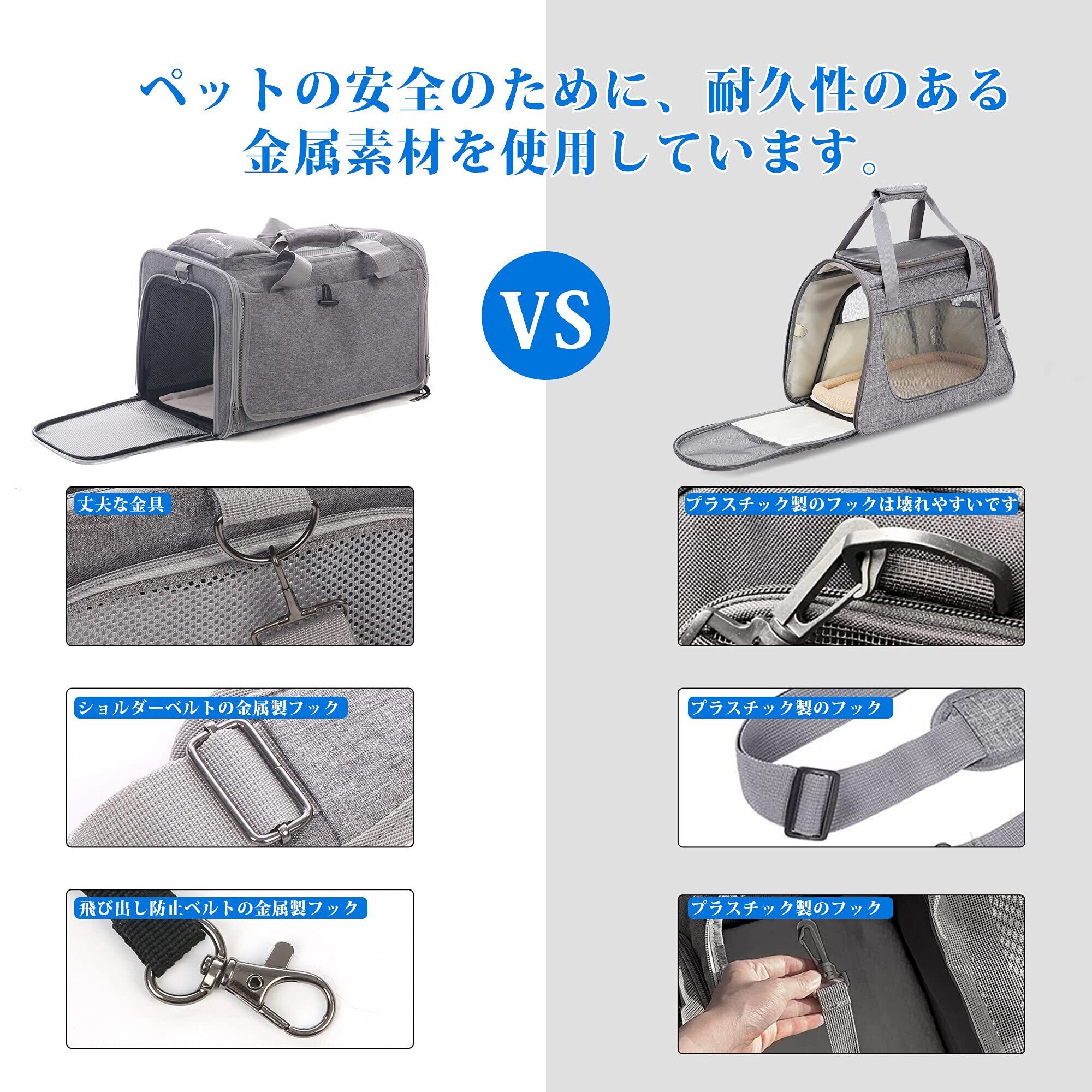 【材質改良】 ペットの安全のために、耐久性のある金属素材を使用しています。ショルダーストラップのフック、ストラップの長さを調整するバックル、飛び出し防止ベルトのフックは、壊れやすいプラスチックのフックではなく、耐久性のある金具を採用しています。壊れやすいジッパーではなく、安全なジッパーを使っています。ペットの快適さのために、ペットにやさしい素材を採用しています。硬い悪臭のゴム網ではなく、靭性で快適な織物網面を使っています。薄い普通の生地ではなく、厚手のオックスフォード生地を使っています。