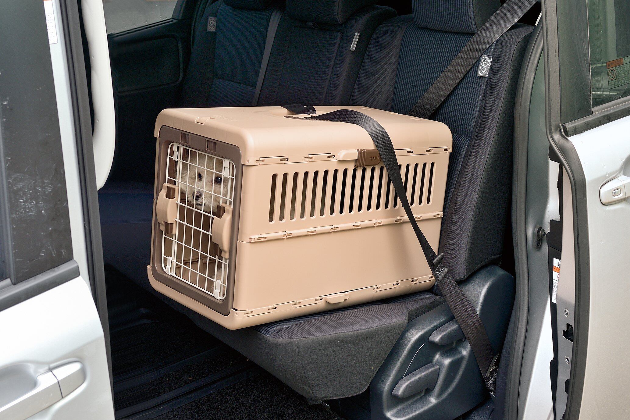 たたんでぺったんこ! 使わないときは、スリムに収納できます。 普段からハウスとして慣れておくことで、来客時や災害時の移動にも安心です。 プラスチック製なので、水洗いできてお手入れ簡単です。 引っかけ部にかけるだけで、簡単に取り付けられるシートベルト固定機能付き。 扉は左右どちらからでも開閉可能で、車の座席を選ばず設置できます。 扉はワンタッチで取り外せます。