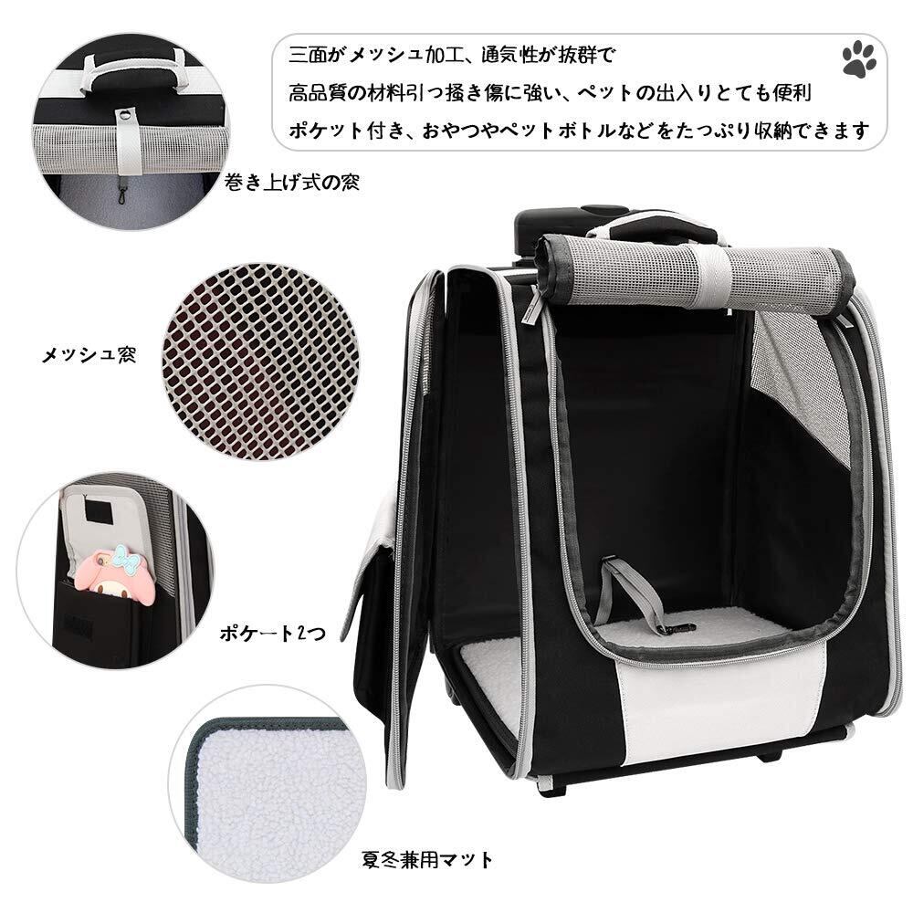 【ペットリュック犬猫兼用通気性がよい】ペットきゃりーケース ローラーは高品質の900Dオックスフォード布、三面がメッシュ加工、通気性が抜群で、窮屈な感じを与えません、ペットの様子も見えるので安心です。正面部分は巻き上げ式の窓付きメッシュ素材なので、ペットの出入りとても便利です。メッシュ窓は高品質の材料を使用して作られて、引っ掻き傷に強い。両サイドにはポケットが付いており。マナー袋やケーブルなどを入れることが出きなので、とても便利の小型犬猫ばっぐリュック猫 リュック型キャリー台車です。