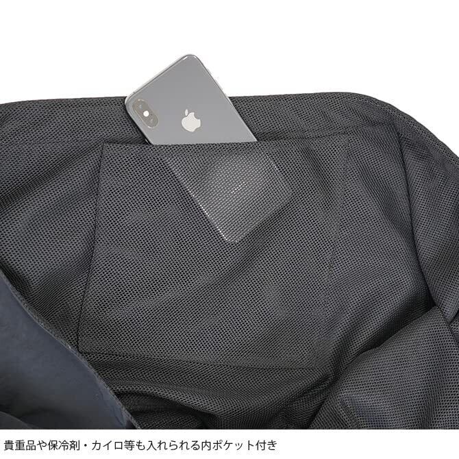飛び出し防止リード2本付き で、貴重品や保冷剤、カイロ等も入れられる内ポケット付き