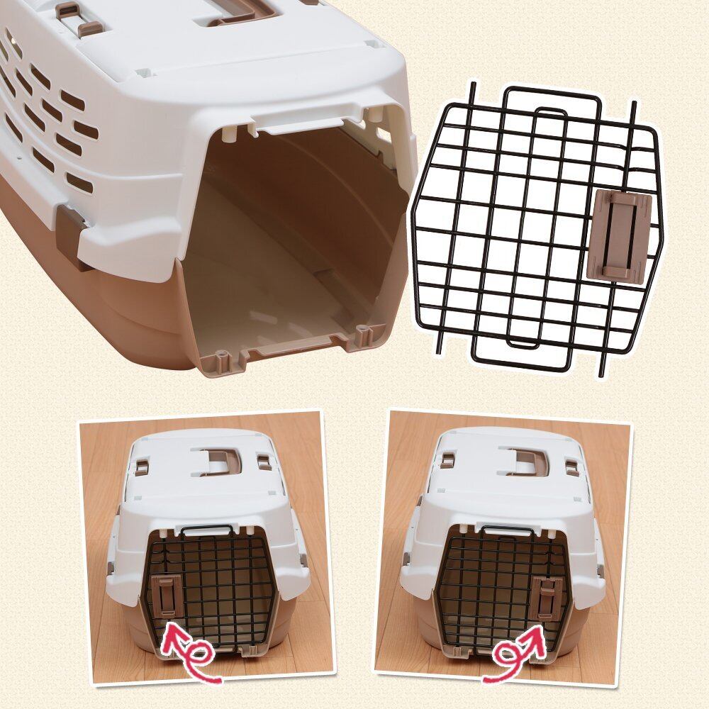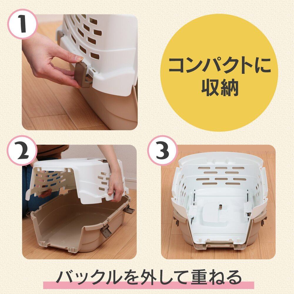 【商品説明】:軽くて持ち運びやすいペットキャリーです。 ■前面と天面に扉がついた2ドアタイプ 【前面扉】 取り付け方向を変えることで、右開き・左開きに変えられます。 扉を取り外して、ハウスとしても使用できます。 【天面扉】 左右両開きで、取り外しもできます。 上からのペットの出し入れがスムーズにできます。 ■コンパクトに収納できる 使わないときはコンパクトに重ねられるので、スッキリ収納できます。 ■水洗いOK プラスチック製なので水洗いできて、清潔にお使いいただけます。 ●商品サイズ(cm) 外寸:幅約38.5×奥行約58.5×高さ約32.5 内寸:幅約35×奥行約52.5×高さ約29 正面扉入口:幅約26×高さ約24 天面扉入口:幅約27×奥行約35.5