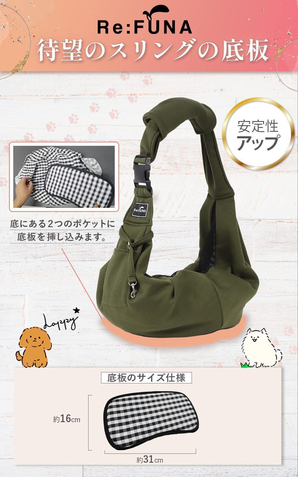 【肩パッド付き ペットスリング 】 ペット専門学校講師監修のもと完成した、最大10kgまで対応可能な肩パッド付きの少し大きめの 抱っこ紐 です。デザインと機能性に徹底的にこだわっており 付属の肩パッドは、長時間の持ち運びによる肩の負担の軽減や長さ調節用のバックルが当たって痛い場合などの問題を解決します。 ペットとの快適なお出かけをお楽しみください。 【2つの脱走防止対策】 ReFUNAの 犬 スリング には、メッシュネットと飛び出し防止のストラップがついております。メッシュネットを被せて紐でキュッと縛り ストラップを首輪とつなげることで、突然の飛び出しにも安心して持ち運びができます。 【バックルで調節可能】 最新型のバックルで身長や肩幅に合わせた細かい調節が可能です。着脱もスムーズにできます。 しっかりとした作りですが、万が一肩などに当たって痛い場合は、付属の肩パッドでバックル部分を包んでご使用ください。 【触り心地のいい優しい生地】 触り心地のいいナイロン素材で作られており、中の裏地はギンガムチェックになっています。 ご主人にもペットにも優しく使いやすい素材です。グレー色のみ少し薄めの生地になっています。 洗濯洗いも問題なくできます。 【パッケージ内容と品質】 底版×1 ※スリング本体はついておりません。 一つ一つ検品しており、商品の品質には万全を期していますが 、万が一商品に不具合があるようでしたら、お気軽にご連絡下さい。 お買い上げから90日以内に不具合が発生した場合は、返金・交換いたします。