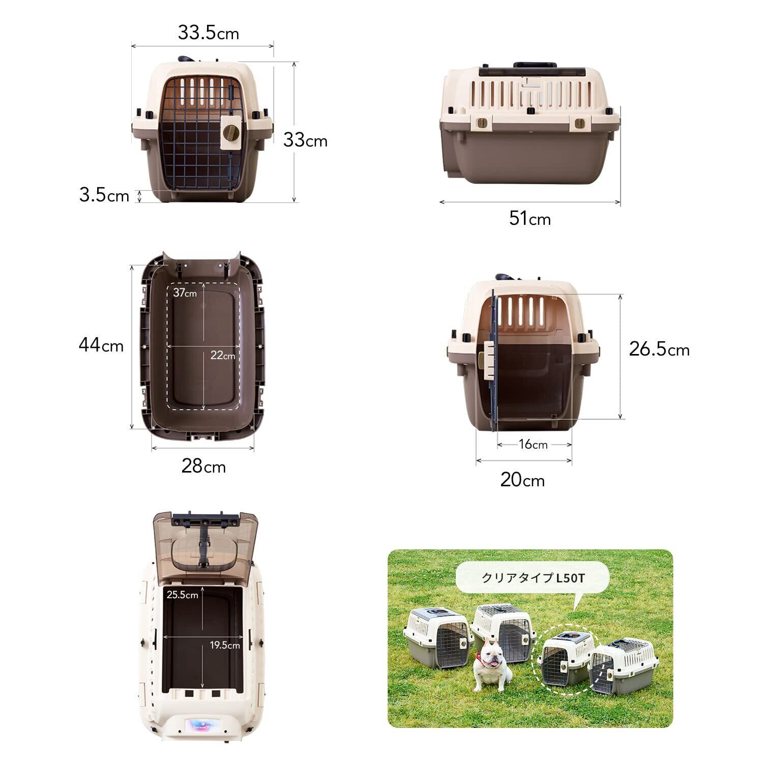 トップオープンクリアL50Tサイズ(約):【外寸】幅33.5×奥51×高33cm【内寸】幅28×奥44×高30cm【底面】幅22×奥37cm【入り口】(正面)幅16×高26.5cm /(天井)幅19.5×奥25.5cm ●重量(約):2.3kg ●耐荷重(約):〜5kg ●材質:【ケージ】ポリプロピレン【ドア】スチール【窓】ABS樹脂 ●生産国:中国(企画・デザイン/中国) ●メーカー:株式会社オーエフティー