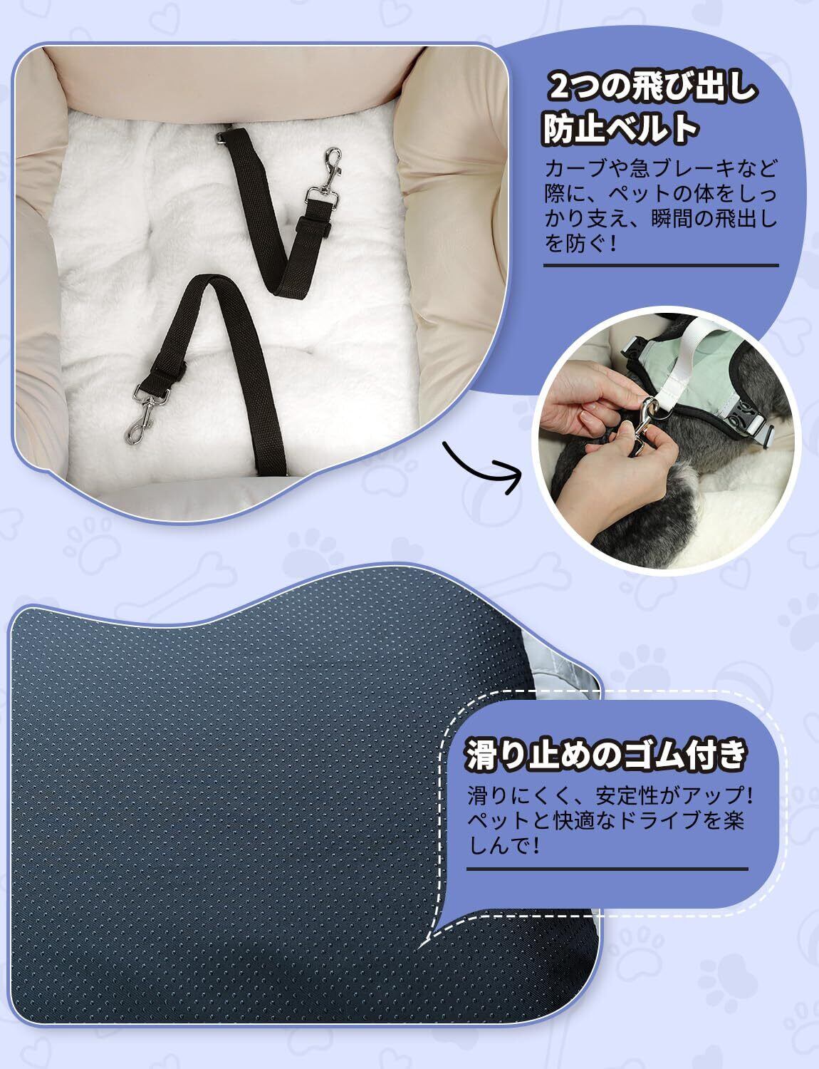【しっかり安定設計】 1、飛び出し防止フック2本付きで急ブレーキ時も安心。2、シートベルト通し固定でがっちりキープします。3、 底面は滑り止めゴム付きで、ずれ落ちを防止します。