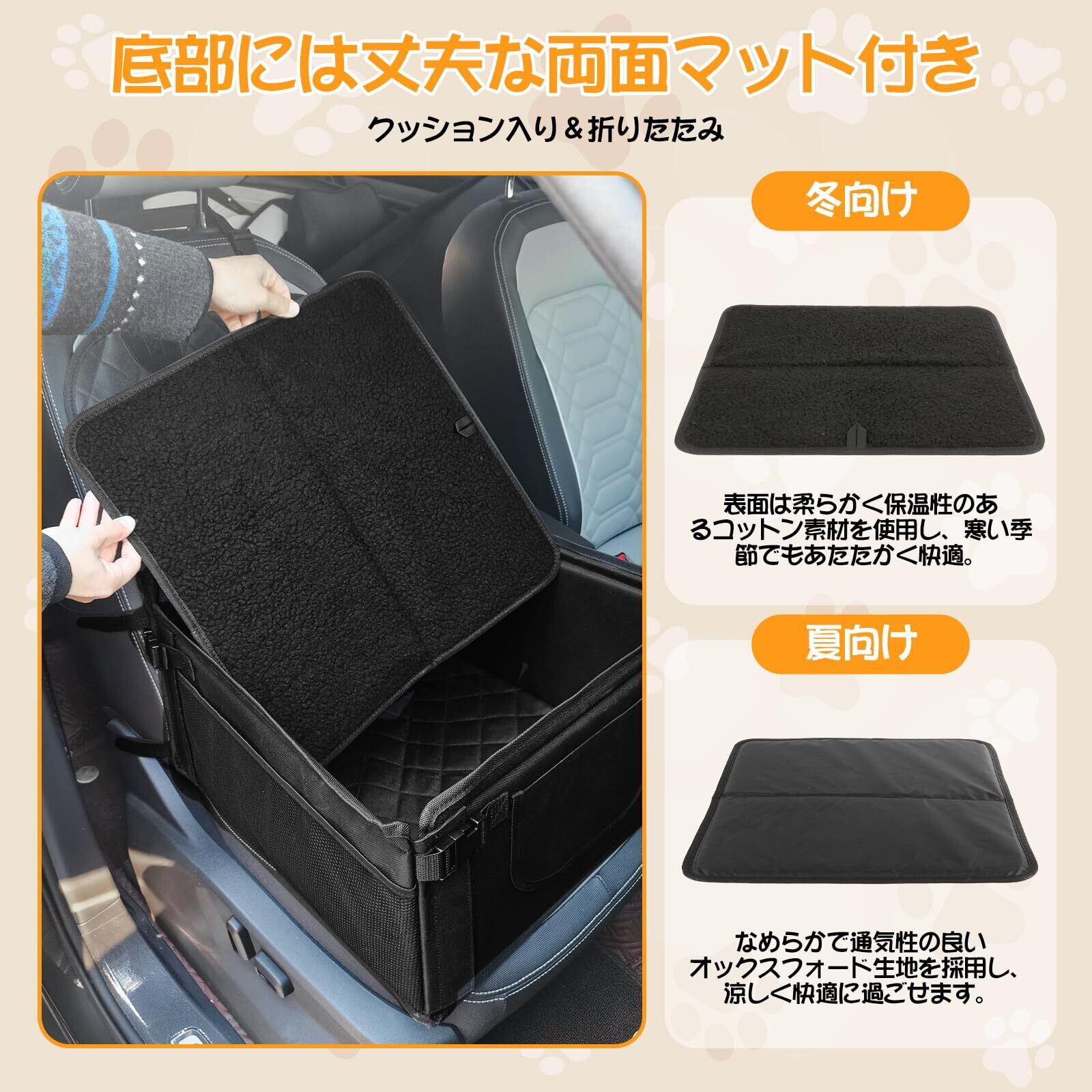 【季節に合わせて使えるリバーシブルマット付き】SuplutuX 犬 ドライブベッド マットは冬にはふわふわ素材で保温性抜群、夏は通気性の良いオックスフォード生地で快適に過ごせる オールシーズン仕様、丸洗いできるので常に清潔を保てます。収納ポケットもあり、リード・おやつ・おもちゃなど小物整理にも便利。