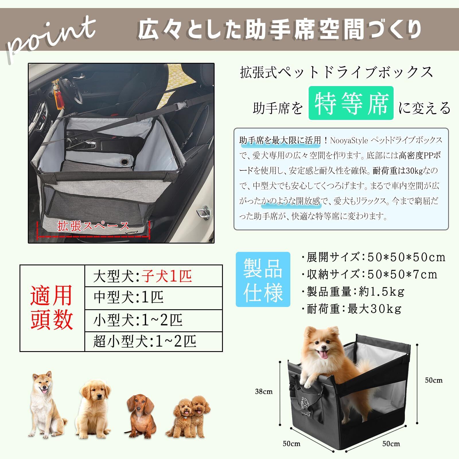 【動物看護師監修だから安心!ゆったり寛げるドライブシート】 NooyaStyle ペットドライブシートは、動物看護師さんの専門的な知見を取り入れて開発されました。何よりも大切にしたのは、大切なご家族であるワンちゃん、ネコちゃんが車内でも「ホッとできる」空間であること。しっかりとした造りが、揺れる車内でもペットを安定させ、まるで自宅のようにリラックスできる環境を作り出します。予期せぬ急ブレーキやカーブでの不安を和らげ、心穏やかに、快適なドライブを体験していただけます。愛犬との『くるま旅』が、より安心で楽しい思い出になりますように。【滑り止め付きシート・丸洗い可能】シートはメッシュ生地で通気性が良く、群れることなく涼しく快適な居心地を提供します。加えて、底面の滑り止め機能により、車のシート上で安定し、また、シートクッションは ペットドライブシート から取り外し可能で、丸洗いが可能なので、いつでも清潔に保てます。さらに、コットン製と比較して静電気が発生しにくく、ペットも快適に過ごせます。【愛犬がのびのび寛げる】NooyaStyle ペットドライブシート の最大の特徴は、後部座席の足元スペースまでフラットに拡張し、驚くほど広々とした空間を生み出すこと。これにより、愛犬は窮屈さを感じることなく、余裕でゴロ〜ンと寝転がったり、大好きなヘソ天ポーズでリラックスしたり、自由に体を伸ばしたり向きを変えたりできます。まるで自分だけの広々とした個室のように、快適な時間を過ごせるのです。さらに、お気に入りのおもちゃや毛布を中に敷けば、愛犬だけの最高の「マイスペース」が完成します 愛犬が安心して体を預けられるので、車酔いの心配も軽減されます。もちろん、表面には丈夫でお手入れ簡単な高耐久防水生地を使用し、清潔さもキープ。【丈夫で長持ち・こだわりの安心シート】私たちが自信を持ってお届けするのは、厳選された高品質素材だからこそ実現できた、驚きの耐久性と快適性を誇る 犬 車 シート です。耐抓耐磨性に優れた600Dナイロンオックス生地は、わんちゃんのいたずらにも強く、長くご愛用いただけます。さらに、防水加工で万が一の粗相や汚れにも強く、いつでも清潔な状態を保つことができ、わんちゃんの皮膚トラブルのリスクを軽減します。さらに内側の裏地には、ペットの肌に優しい滑らかな230Tポリエステル生地を使用します。快適な肌触りはもちろん、中綿の飛び出しを防ぎ、製品の耐久性も格段に向上させています。型崩れ防止と安定した形状維持のため、底面に補強板1枚&前後面にサポートクッションを内蔵し、しっかりとした作りで、犬がもたれても、安心のホールド感を実現しました。