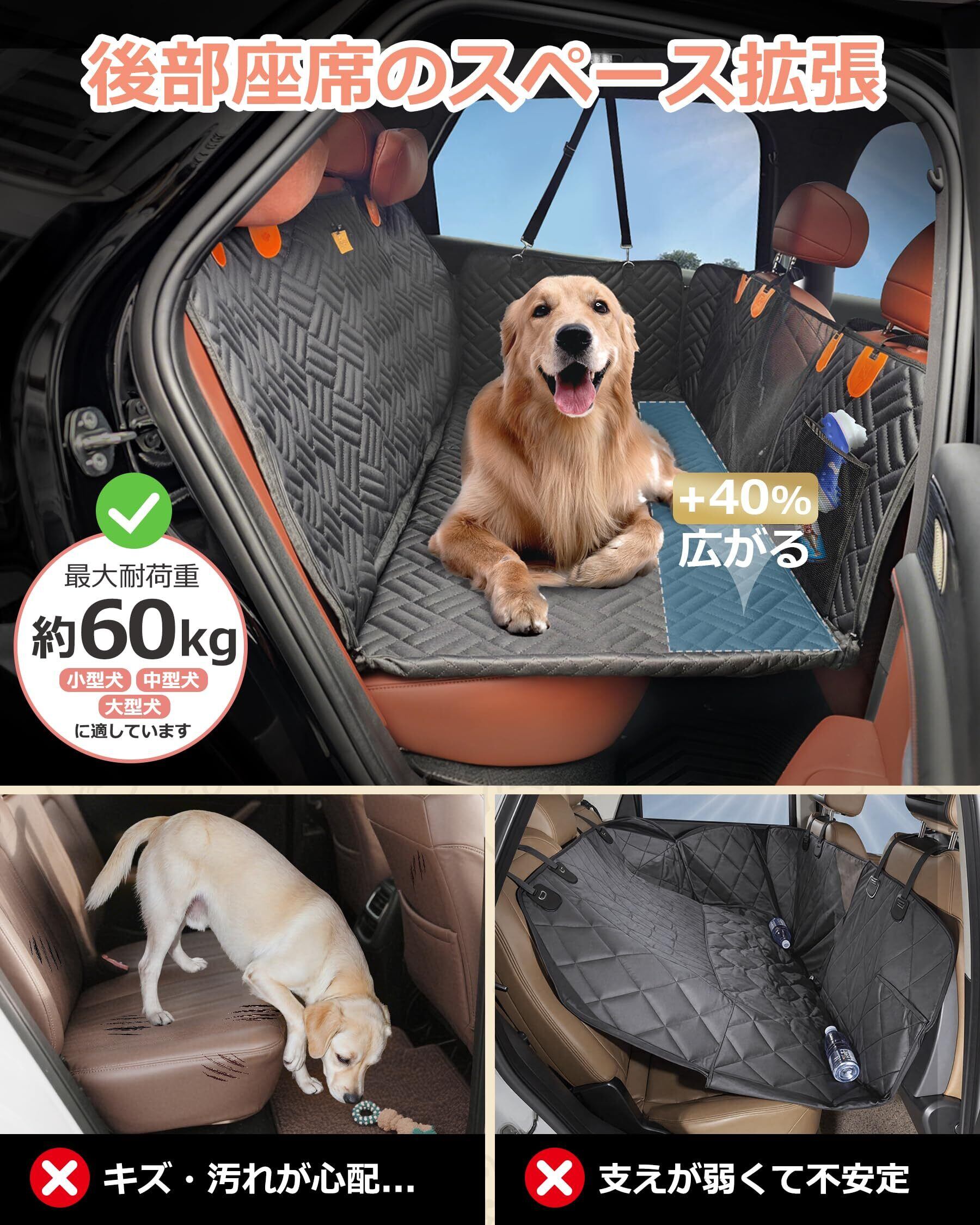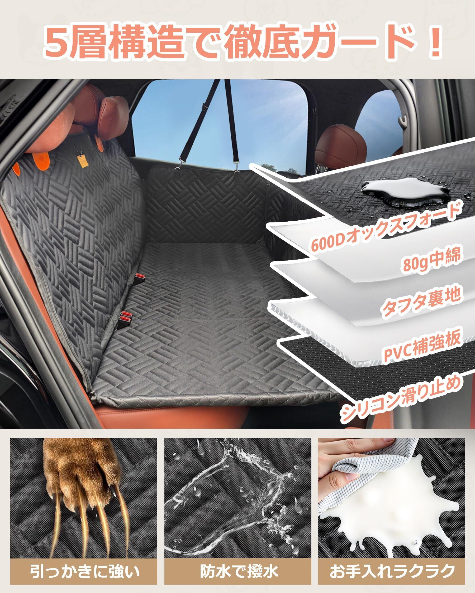 【多機能カーシート & 広いスペースデザイン】 このペットドライブシートは、愛犬・愛猫とのドライブを快適にサポートする多機能タイプです。爪による引っかき傷や抜け毛、汚れから車内をしっかり保護。防水加工により水やおしっこも浸透せず、車内を清潔に保てます。ゆったりとした設計で十分なスペースを確保し、ドライブ中も快適に過ごせます。