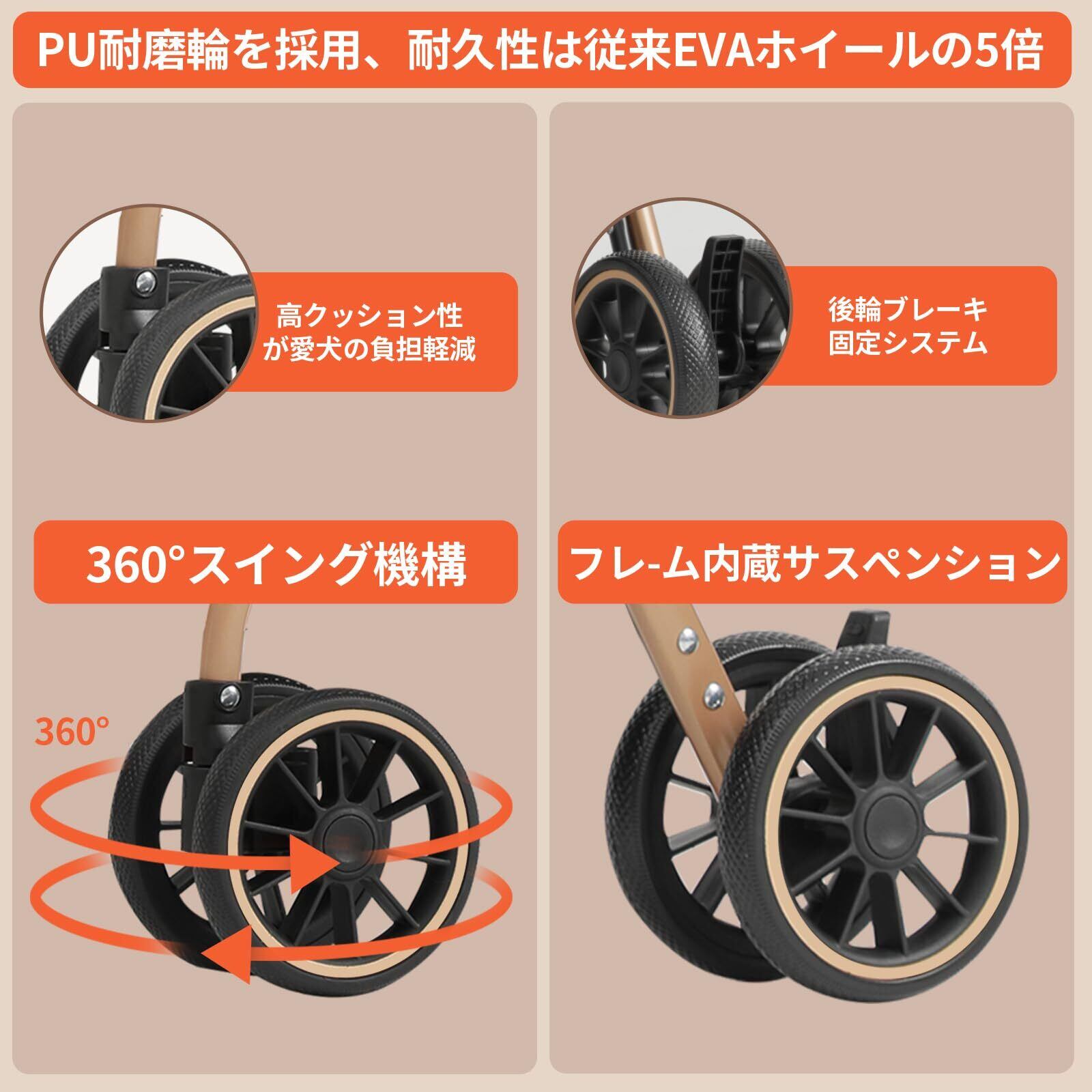 【安定走行・耐摩耗性】この犬用カートは 4 つの大型耐磨耗ホイールを採用,安定性と耐久性を両立して転倒を防ぎ、玉石道や草地などの凹凸路面でも安全舒适かつ安定して走行可能。前輪 360° 回転で狭い路地や室内もスムーズに通過,後輪には操作しやすいブレーキ装置を標準装備。