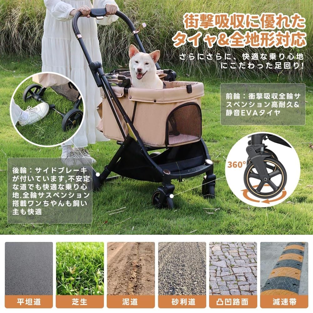 【安定性抜群】犬用カートは耐摩耗耐滑加工の高品質タイヤ、前後輪ともサスペンションを搭載、更に後輪には精密な二重軸受を装備し、丈夫で障害物を越えやすく、優れた振動吸収効果を発揮します。力学設計による三角形構造で転倒しにくく、砂利道、石畳、レンガ路、減速帯、芝生などの悪路でも安全快適な安定走行を実現します。360°回転左右前輪は小回りがきくので、方向転換が簡単になります。より耐摩耗性がありのPU+EVA素材を採用し。大き目の車輪を採用しており、とても滑らかなタイヤ運び。足踏みストッパ-付きで、休憩や坂道でドッグカートを止める際も安心!【いろんな場所で大活躍】公園や郊外へのお出かけ、電車、病院、帰省、旅行、ドッグカフェやペットイベントなど、ペットカートがあると便利な場面は多いです。中小型犬、多頭飼いの方におすすめ!