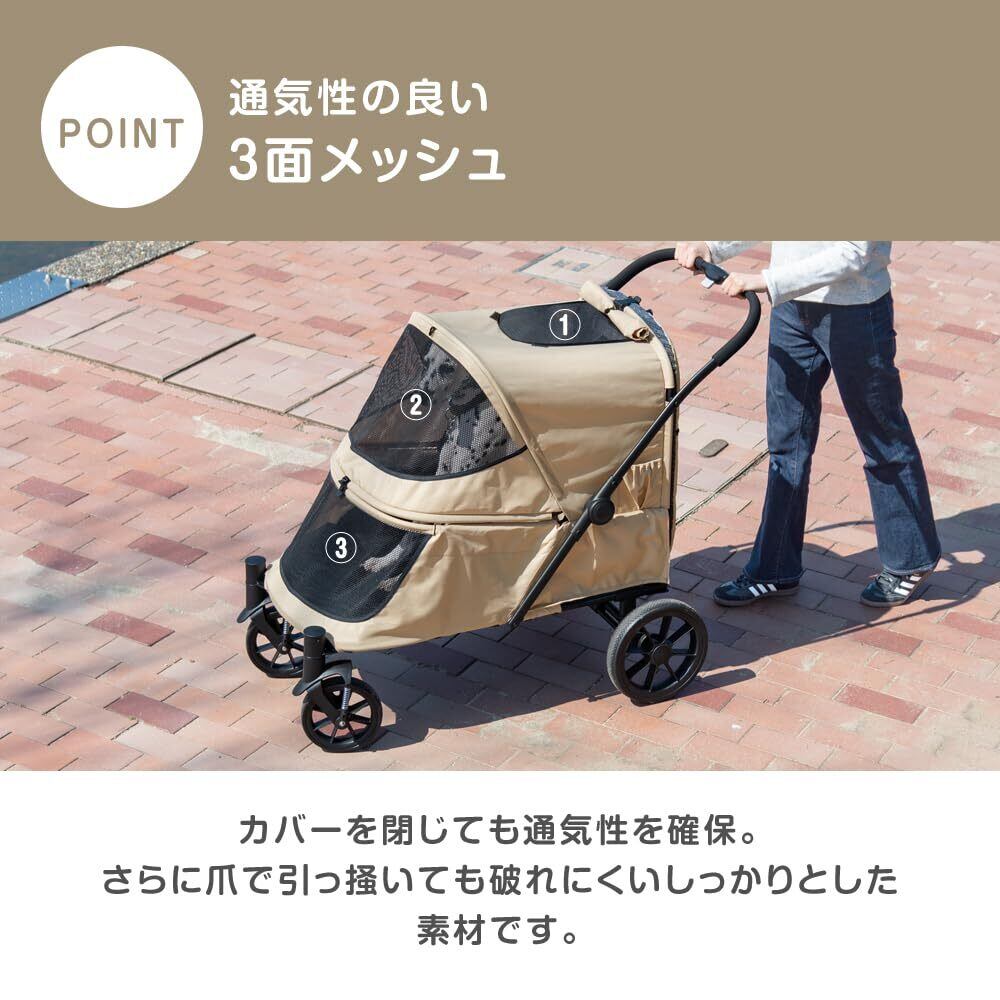 【スタッフのおすすめポイント!】 乗り降りラクラク!スロープ付きペットカート ・大型犬対応 安心の耐荷重60kg ・わずか2秒 ワンタッチで折り畳み ・乗り心地バツグン、前輪サスペンション ・移動がよりスムーズに、べアリングを内蔵したホイール ・固定に便利な後輪ストッパー ・いつでも清潔 座面カバー水洗いOK ・通気性の良い 3面メッシュ ・お散歩グッズにぴったり 背面収納 ・2匹で仲良くお出かけできるリード2本付き