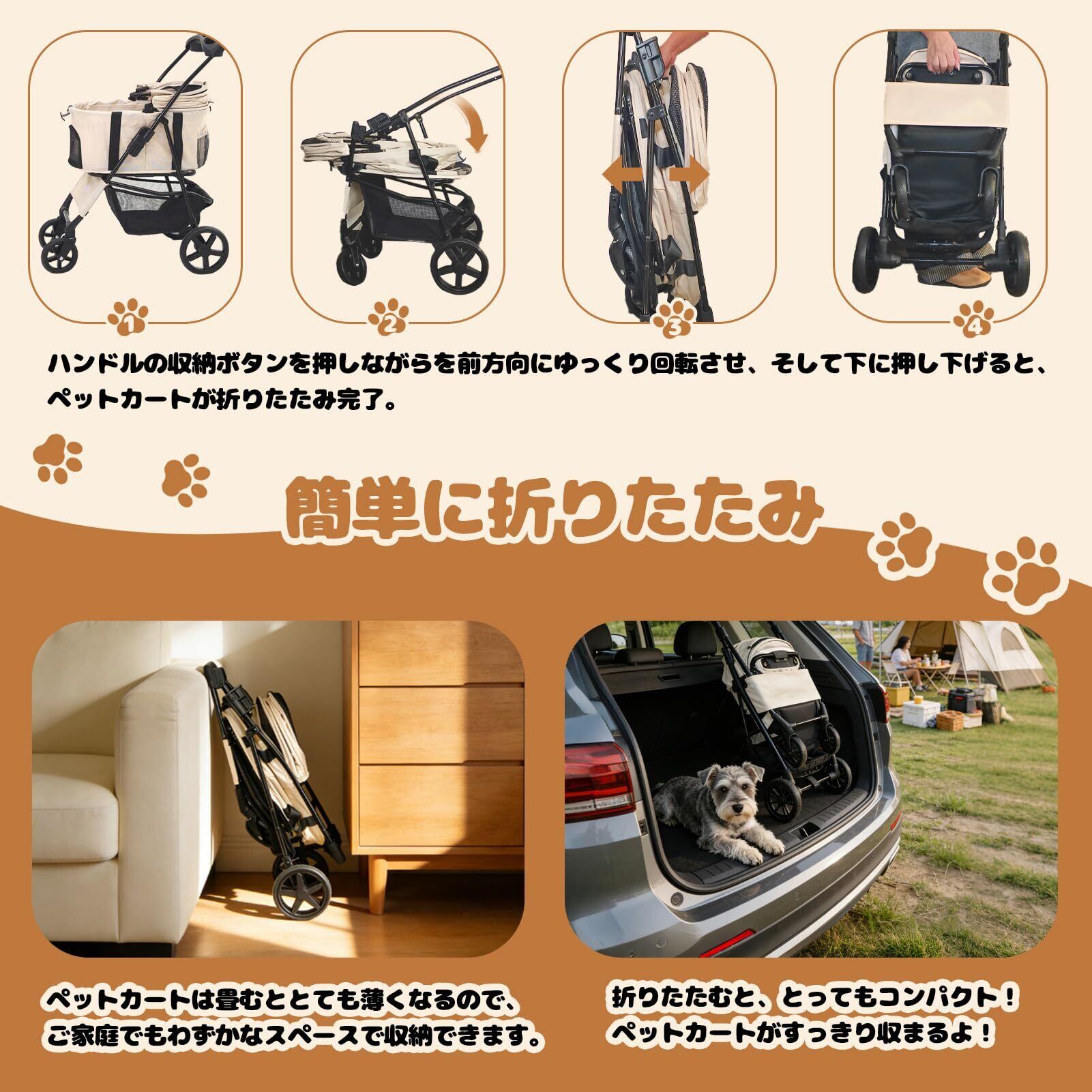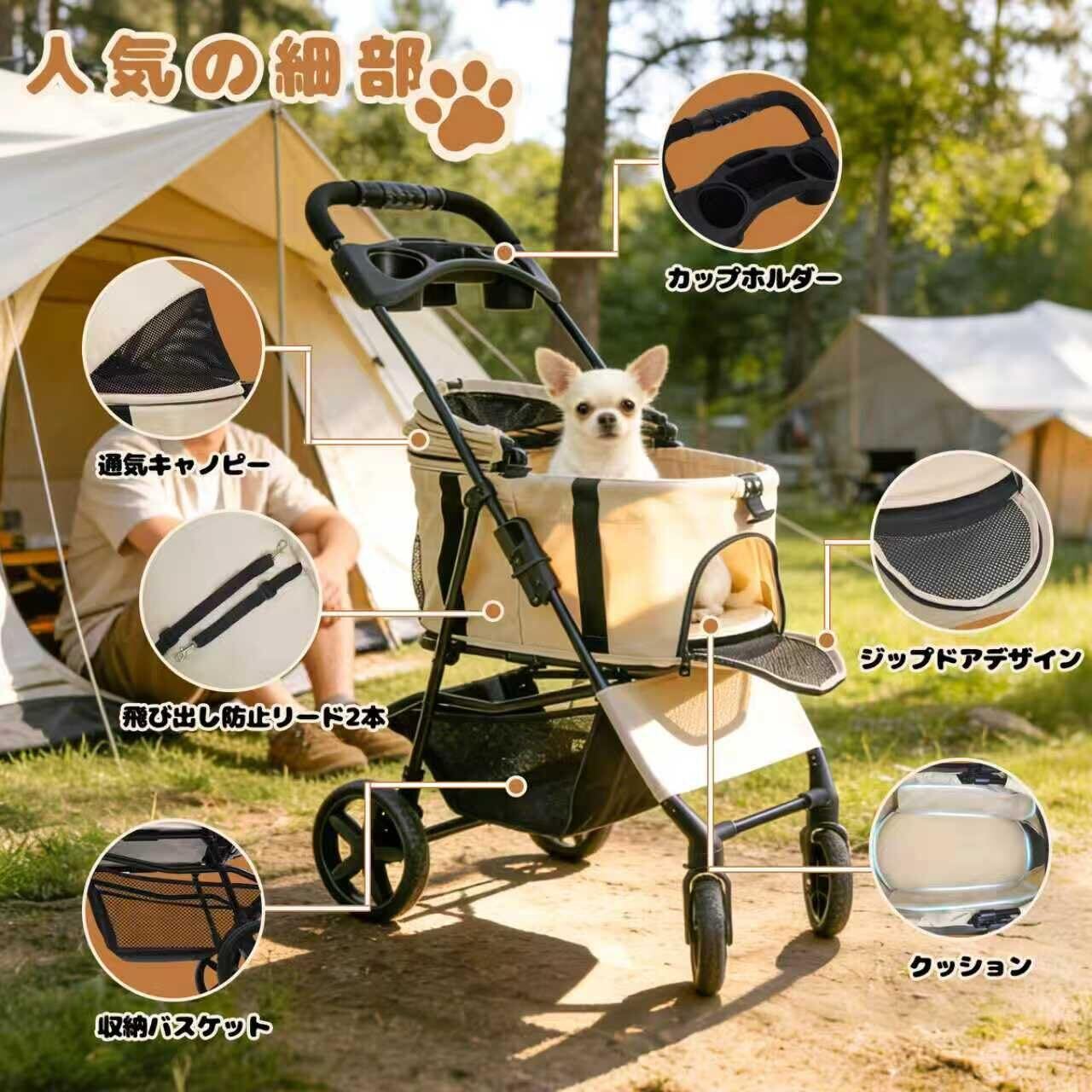 【コンパクト収納と大容量収納バスケット】フレームはコンパクトに折り畳めるため、収納や車のトランクへの積み込みも楽々。カップホルダーと底部に収納バスケットがあり、散歩や買い物の外出時に必要なペット用品などの収納には十分な容量があります。通常小型種1-2頭か中型犬を乗せることができます。