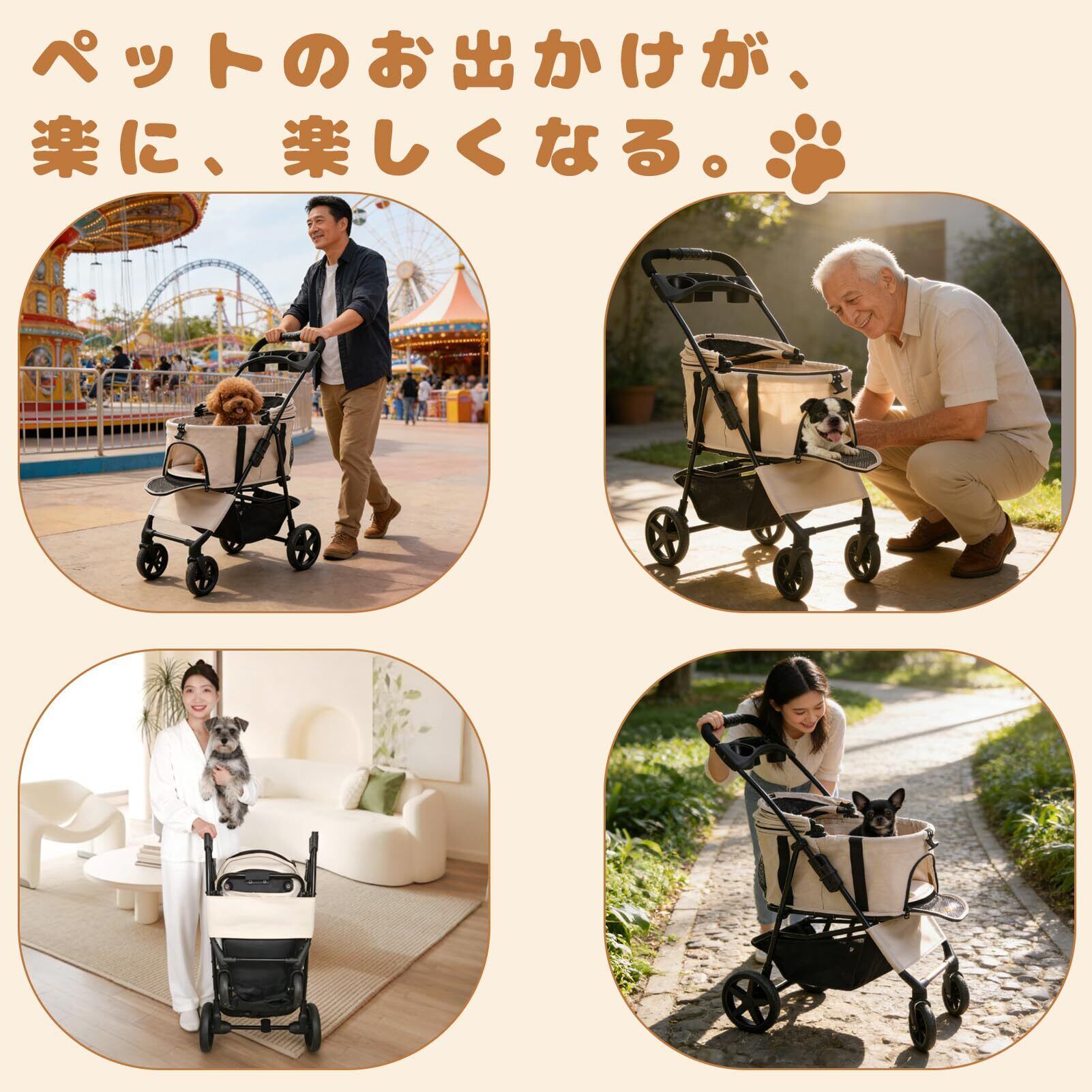 【分離式デザイン】ペットカートケージ本体とフレームが簡単に分離可能です。取り外したケージ本体は、そのままペットの車載シートとしてお使いいただけます。公園や買い物、ドッグカフェ、通院、旅行など、さまざまなシーンでご利用ください。