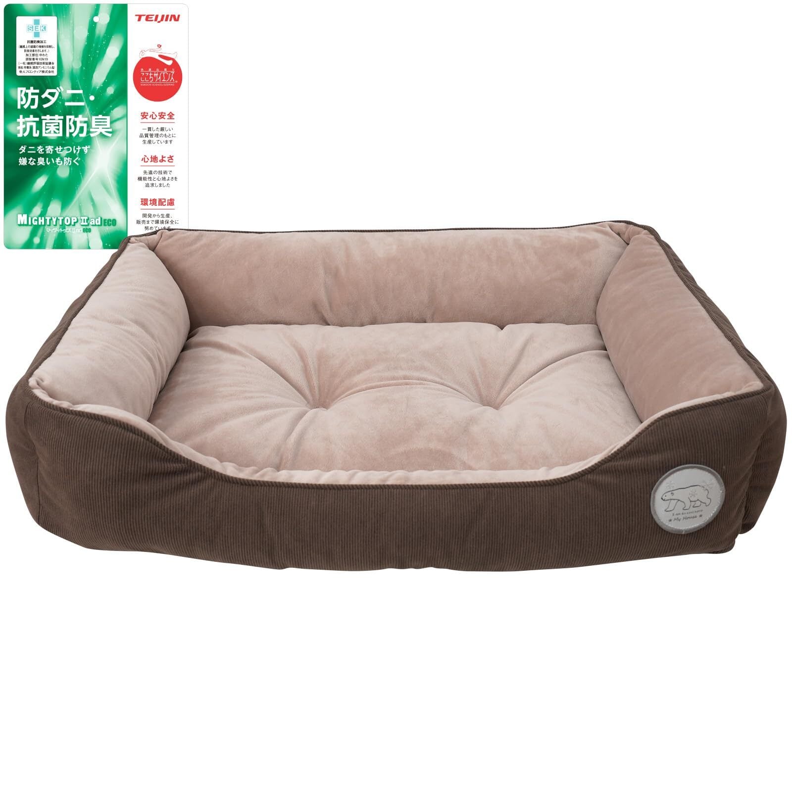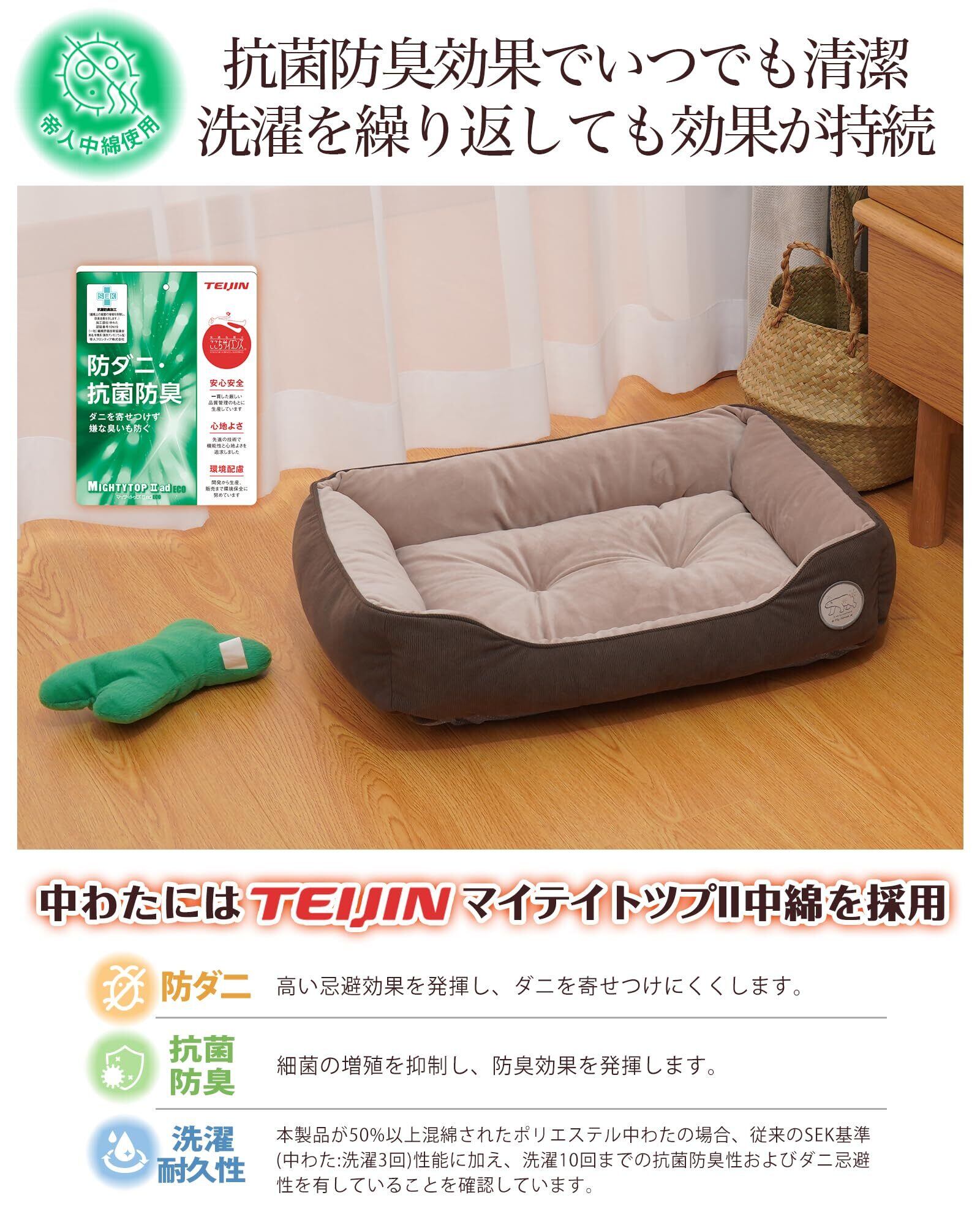 【帝人中わた使用:抗菌防臭効果でいつでも清潔、洗濯を繰り返しても効果が持続】のペットベッドの中綿は帝人のフィルケアECOわたを使用、抗菌防臭効果と洗濯耐久性で、清潔な心地よさと何度でも洗える安心をお届けします。