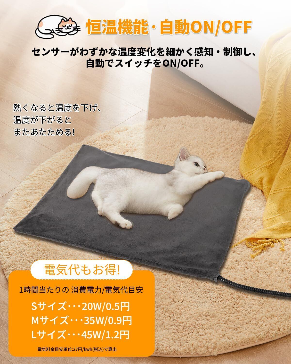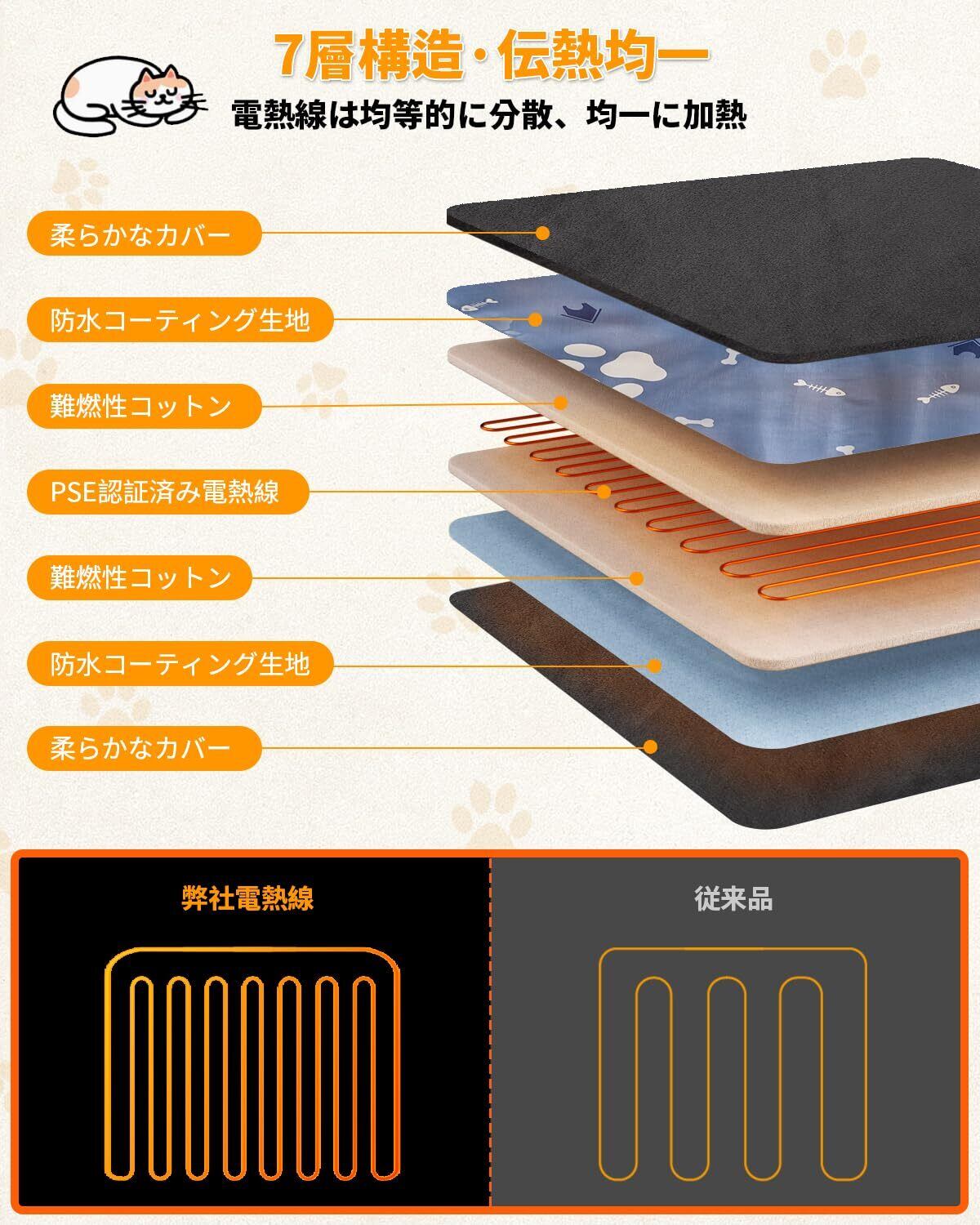 【7層構造・お手入れ簡単】ペット用ホットカーペットは7層構造です。マット本体の素材は防水加工を施していて、カバーを使わなくてもお手入れが簡単です。ペットをマットの上に乗せると、10分ほどでホットカーペットが設定温度に達します。ペットの温度感覚は人間と異なり、人間より低い温度を必要とするため、お客様は手で触って暖かく感じなくても、ペットがヒーターの上に寝ると暖かくなります。