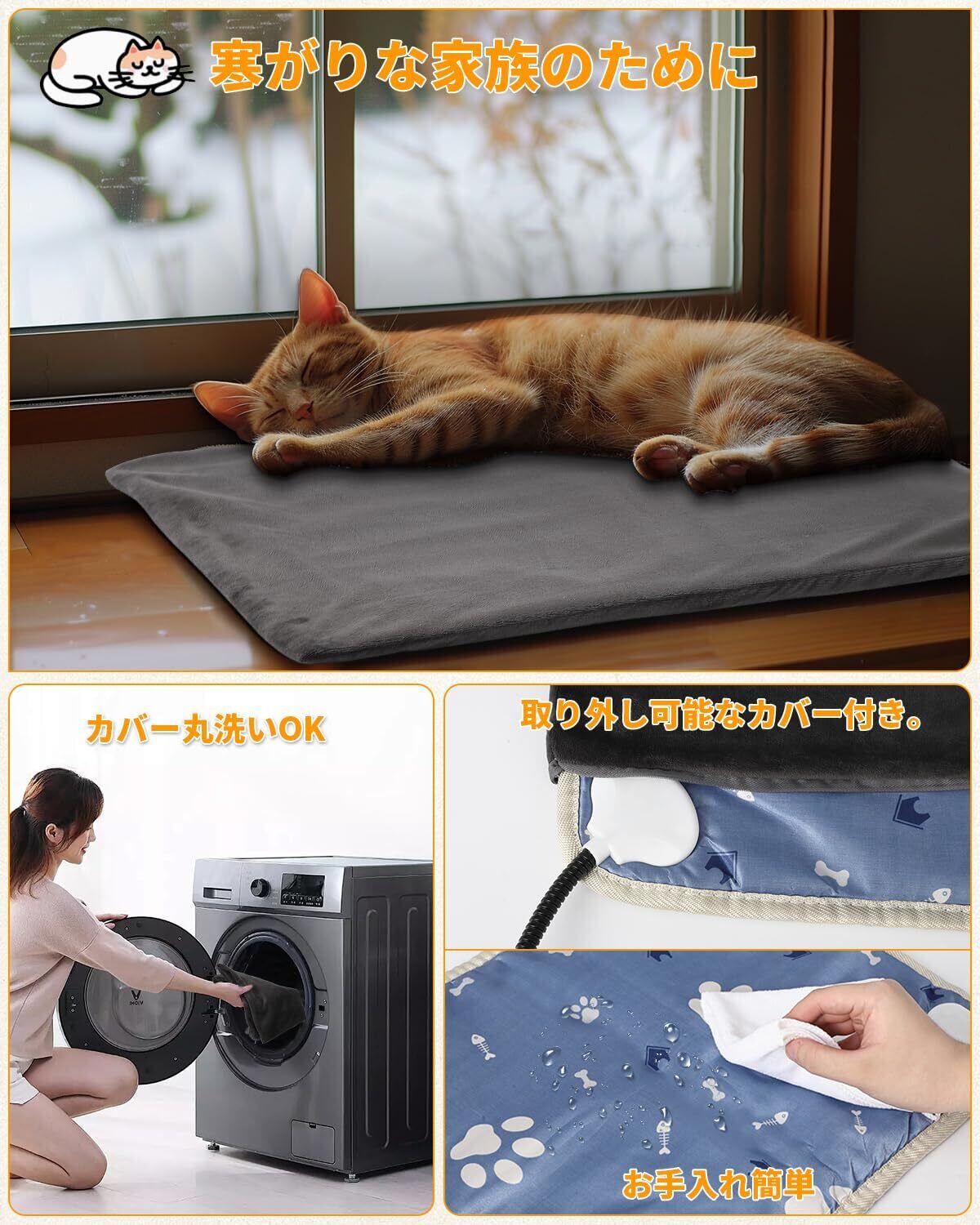 【噛み癖対策&カバー丸洗い可能】電源コードにはプラグの根元までがっちりした金属製のスパイラルチューブで補強され、全長約1.7m(コントローラを含む)です。全て鋼管で保護され、露出部分はなく、噛むや引っ張ることを完全に防ぎます。高品質なフランネル素材を採用し、ふかふかな手触りが心地良く、取り外し可能で、いつでも洗濯機で丸洗いできます。