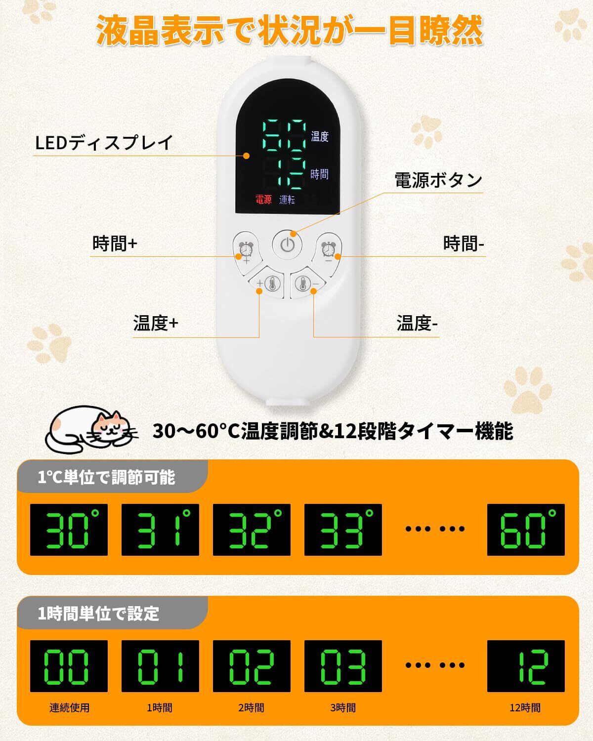 【12段階タイマー機能&自動保護機能】ご必要に応じて適切な時間(1/2/3...12H)を1時間単位で12段階設定することができます。時間を設定せずに連続使用したい場合は、タイマーを「00」に設定すれば常に動作になります。コントローラーの温度が60℃に達すると(例えば、コントローラーを誤ってヒーターマットの上に置いた場合)、コントローラーの液晶画面に「警告」が表示され、そして自動的に電源を切ります。