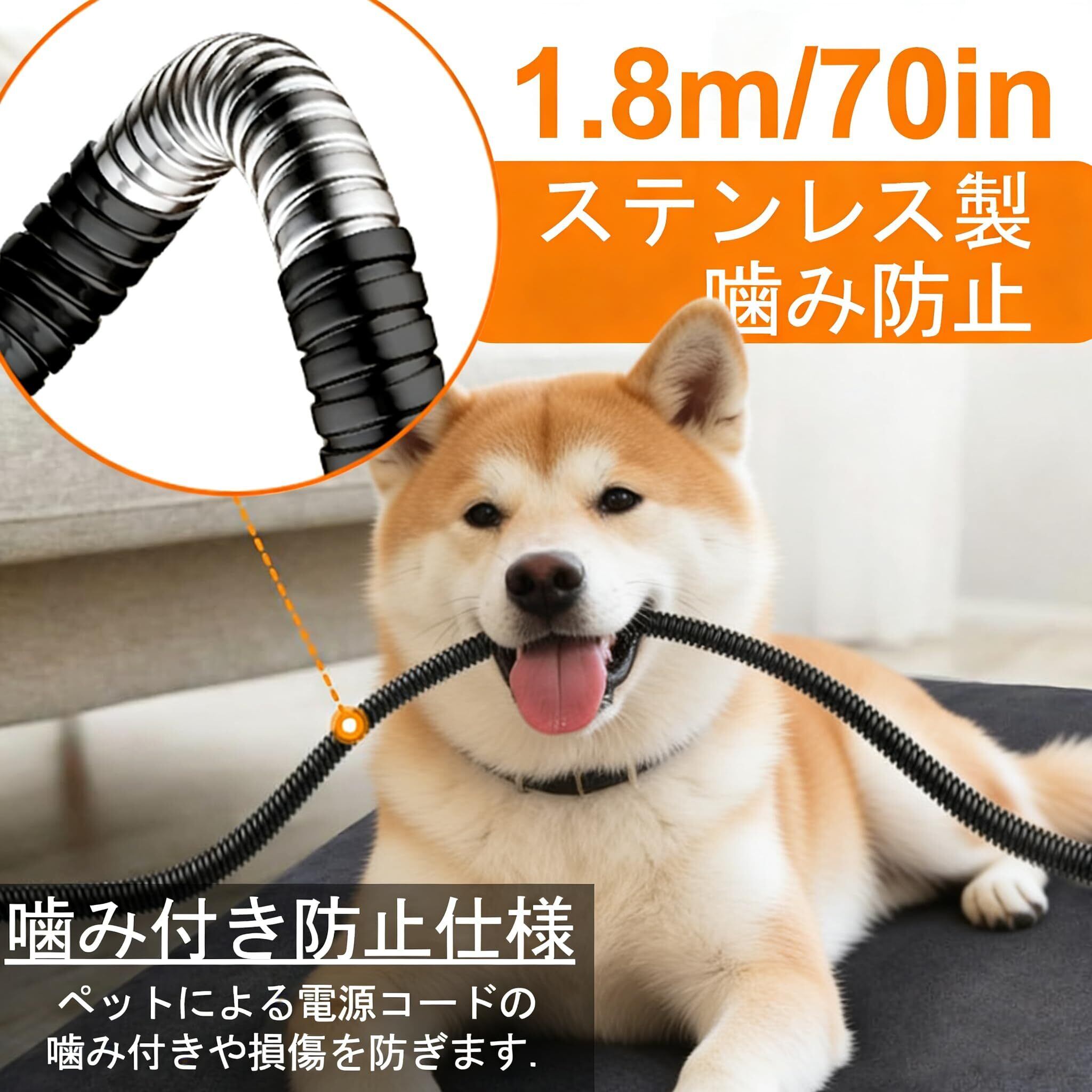 【7層構造、噛み付き防止・過熱保護機能付き】当社ペットヒーター 犬ペットは7層保護構造です。電源コードにはプラグの根元までがっちりした金属製のスパイラルチューブで補強され、全長約1.8m(コントローラを含む)です。、全て鋼管で保護され、露出部分はなく、噛むや引っ張ることを完全に防ぎます、噛みつきや感電のリスクを心配する必要はありません。環境に優しいPVC内装材を採用し、ホットカーペット本体は先進的なIP67防水加工の生地で作られており、ペットの尿やこぼれた水が内部に浸透するのを防ぎ、感電の危険を防止します。