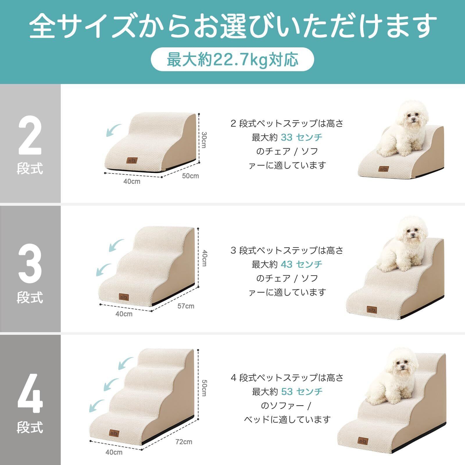【ご注意点とサイズ選択】 本製品は大型犬には非対応です。段数別推奨:2段は椅子、3段はソファ、4段はベッド、5段はハイベッドや車両用。ご購入前には設置場所の高さをご確認ください