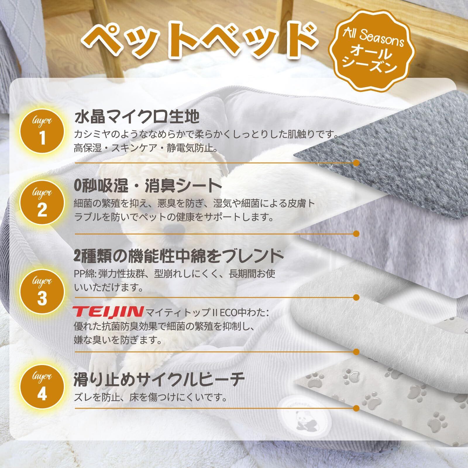 【帝人抗菌防臭・低アレルギー】ペットベッドは帝人マイティトップⅡECO中わたを使用し、抗菌防臭加工が施されており、細菌の繁殖を抑制し、長期間にわたって清潔な状態を保ちます。ダニの発生を抑える効果があり、アレルギーや皮膚のトラブルを防ぎます。特に、アレルギー体質のペットにはポイントです。