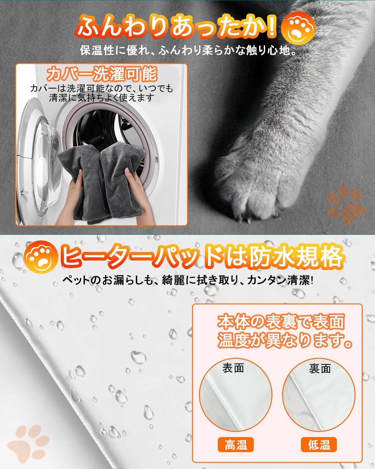 【ふわふわカバー付き&丸洗い可能】ペットホットマットを、肌触り抜群のマイクロフリースで覆っており、気持ちの良い居場所となるような生地になっています。汚れた時やオシッコの場合も、洗濯機/手洗い どちらでも丸洗いが可能なため、気になる臭いの予防にもなります。また、ホットカーペット本体も防水仕様で出来ているため、オシッコなども拭き取ることが出来、いつも清潔に保てます。