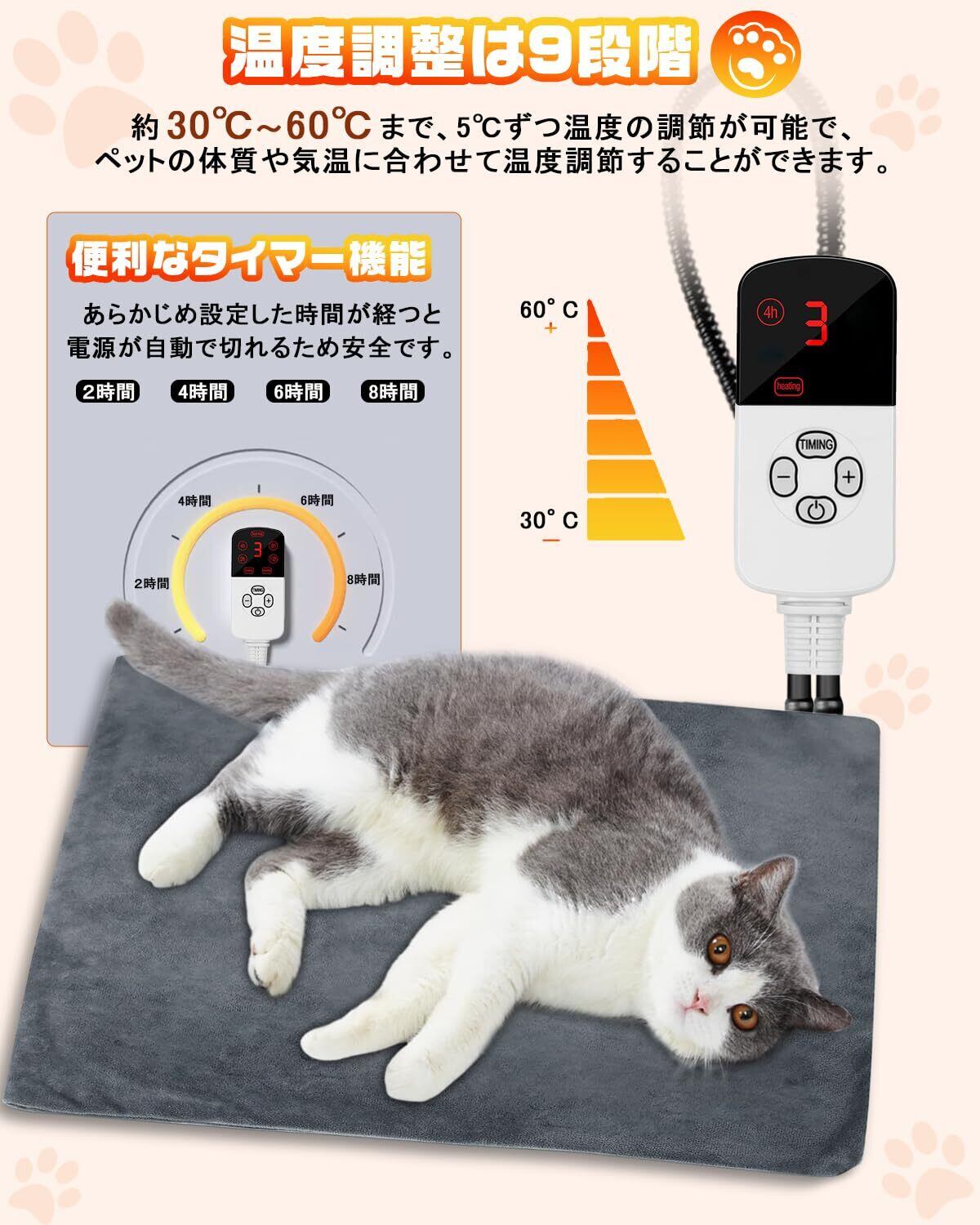 【切タイマー&過熱防止機能】切タイマー機能がついているので、タイマーボタンで2時間・4時間・8時間・12時間など切る時間を設定し、つけっぱなしで出かけられます。低温やけどの心配もないので安心です。また、ペット用ホットマットはサーモスタット機能搭載で、温まりすぎを感知すると自動で運転を停止します。