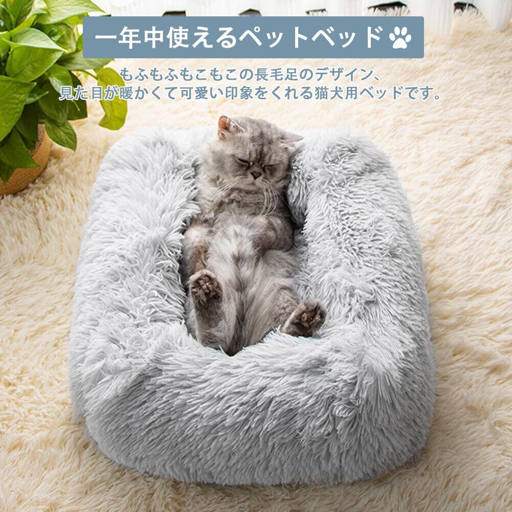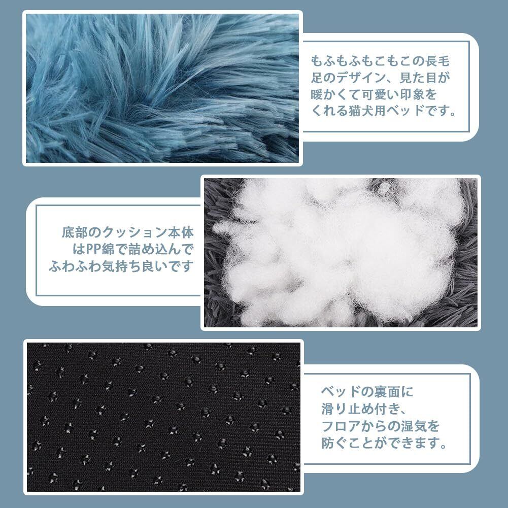 1.一年中使えるペットベッド。もふもふもこもこの長毛足のデザイン、見た目が暖かくて可愛い印象をくれる猫犬用ベッドです。曇りのような柔らか素材、保温効果が良い、寒い秋冬の防寒対策も冷房が効いてる室内も、寒がりなわんこと猫に助ける暖かい寝床です。底部のクッション本体はPP綿で詰め込んでふわふわ気持ち良いです。このベッドに横になって、ぐっすり眠れることに間違いなしです。