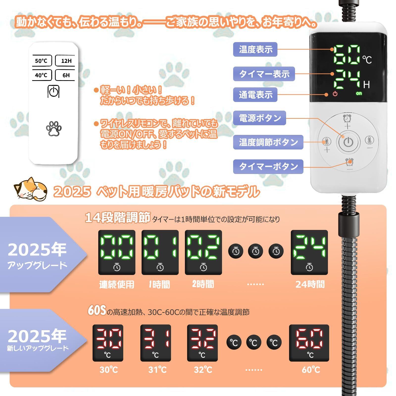 ペット用ホットカーペット ベッドマット 業界初リモコン搭載【2025年独自開発コントローラー・ペット専門家鈴木監修】70×45cm 犬 猫 ペットヒーター 30℃~60℃温度調節可能 14段階タイマー・新機能24時間設定対応 省エネ自動オフ&前回設定記憶機能 PSE認証済 噛み防止対策 カバー2枚洗濯可 過熱保護 IP67防水設計 暖房器具 寒さ対策 小型・中型動物 日本語取扱説明書