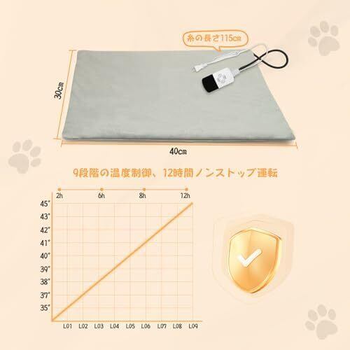 【9段階温度調節可能】ペット用ホットカーペットは35〜45度の9段階温度レベルに調節できます。 使用環境やペットの反応に合わせて温度を細かく調整できるので、季節に合わせた適切な温度が使いやすくなります。 内蔵サーモスタットが温度を一定に保ち、過熱を防ぎます。 優れた恒温機能はペットに最も快適な温度を提供し、冬を快適に過ごします。