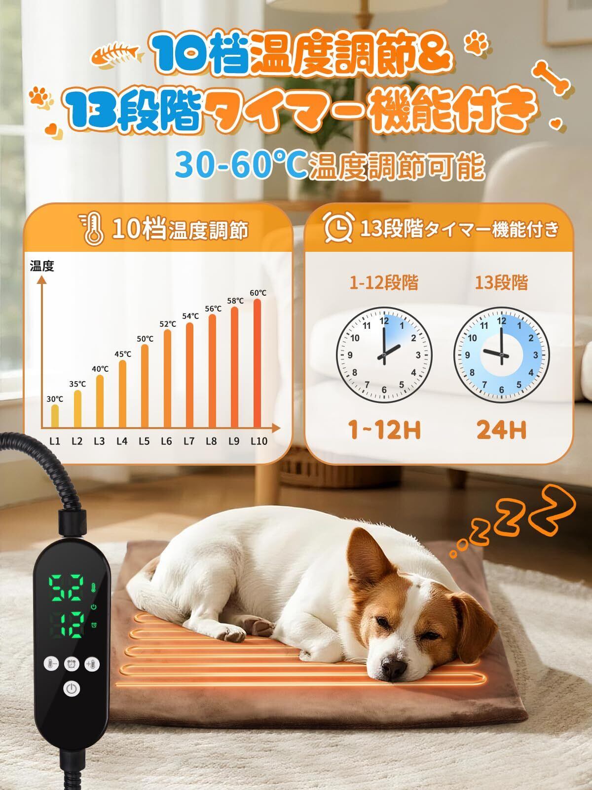 【13段階タイマー・10档温度調節機能搭載】Zaahir ペット用ホットカーペットは、ペットの安全と快適さを第一に考え、13段階のタイマー機能(1~12H/24H)と10段階の温度調節(30~60℃)を搭載しています。温度調節がめちゃくちゃキビキビして、30℃~50℃の範囲は5℃ごとに温度を気軽に調えられ、50℃以上になると2℃ごとの細かい温度調整に切り替わります。ペットの快適さに基づいて温度を正確に調節することで、ペットの安全を最大限に守りつつ、最適な温感を提供します。もう温度が冷たすぎたり熱すぎたりする心配はありません。どこにいても「安心の場所」になる、母に守られているようなしっかりとした安心感を届けます。