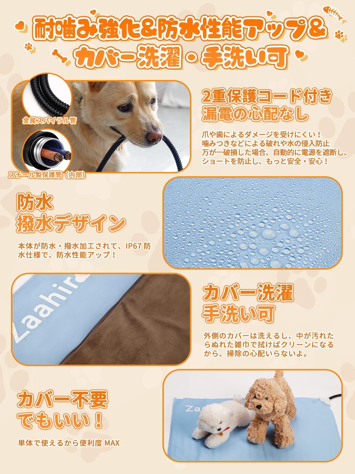 【内層防水・カバー取り外し可】このペットヒーターは清潔・安全を両立した安心仕様、内層はIP67防水規格!環境にやさしい素材で熱圧加工したから、防水力もアップ~抗菌・ダニ防除機能までついて、ペットちゃんと一緒に使うと超安心よ!ペットの唾液や尿で汚れても、オシボリでサッと拭くだけで清潔さを簡単に維持できます。カバーが乾かなくても、ペットは暖かく快適に眠れます。さらに、カバーは超柔らかいフリースで、取り外しも簡単!洗濯機で洗える上、手洗いも可能です。清潔さを心配する必要がなく、ペットも安心して使用できます。