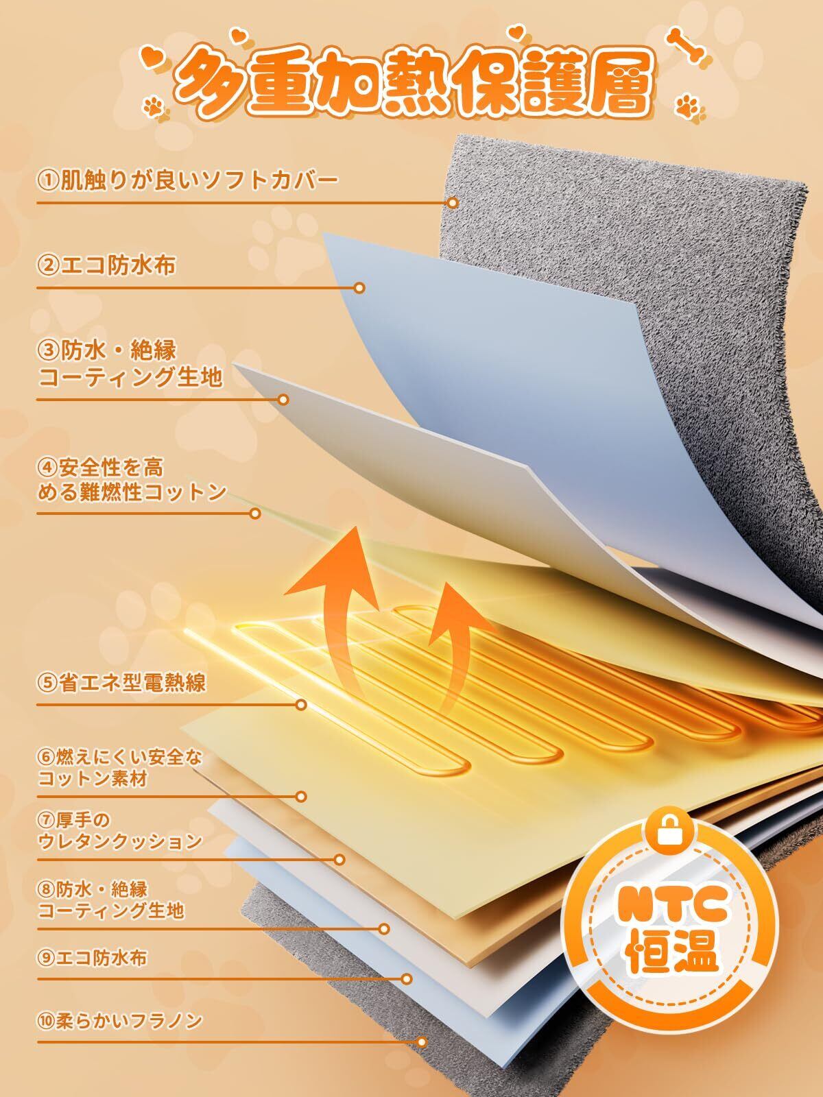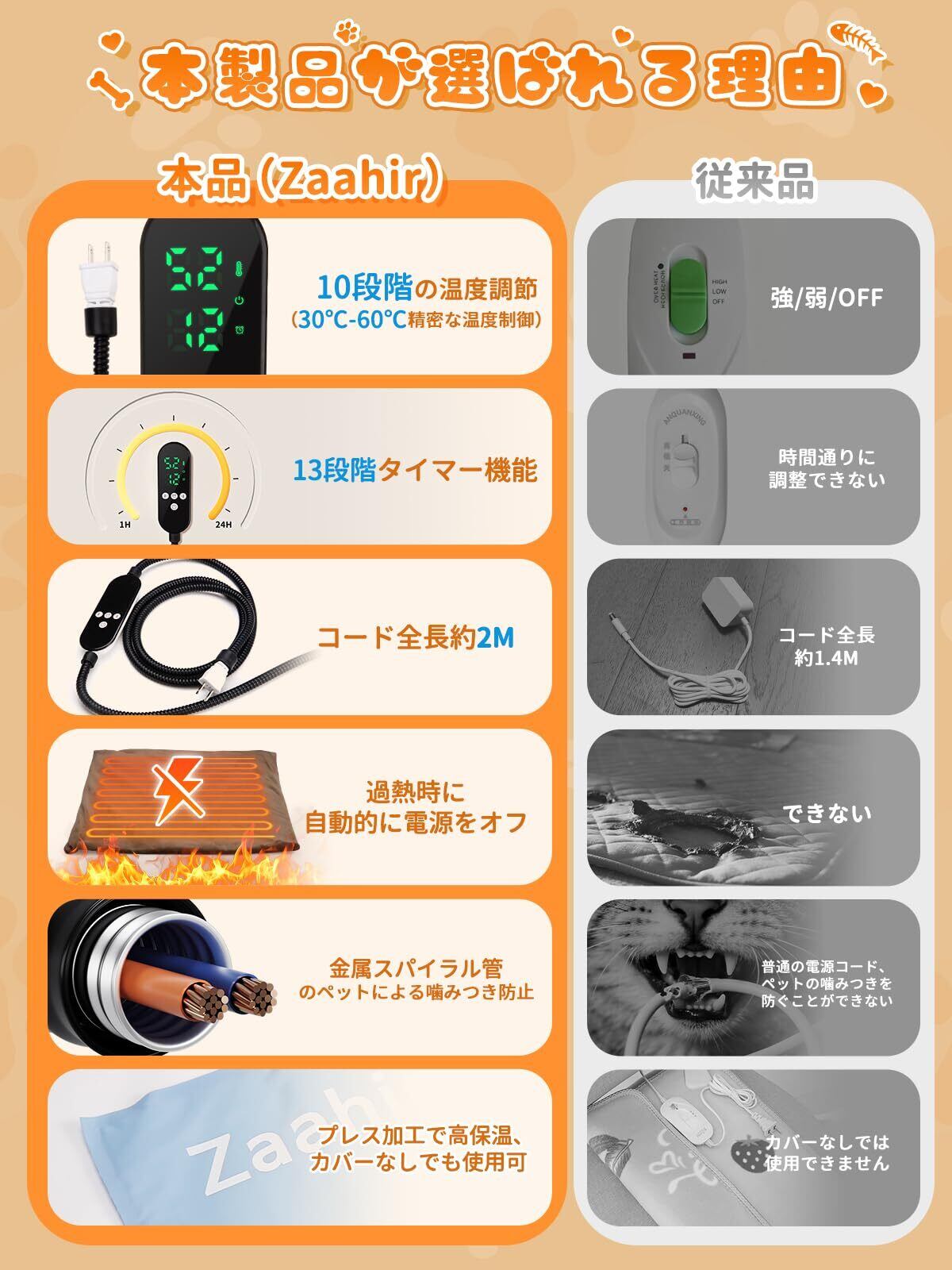 【NTC恒温・過熱保護・暖かい冬を守り】Zaahir猫ホットカーペット内はNTC温度センサーとU字型回路ヒーターを置いて、設定の時間と温度に基づいて均一に温めて、過熱を防止します。また、内部回路には過熱保護の取り付けとショートと漏電を配備してチップを保護します。もし温度異常時には即座に自動的に電源が切れます。長時間家を出かけても心配いらない。ペットが温度むらで具合が悪くなることを防ぎ、その安全を安心して任せられます。ペットが朝から夜までちょうどよい温かさの中に包まれ、快適に冬を過ごせるようになります。