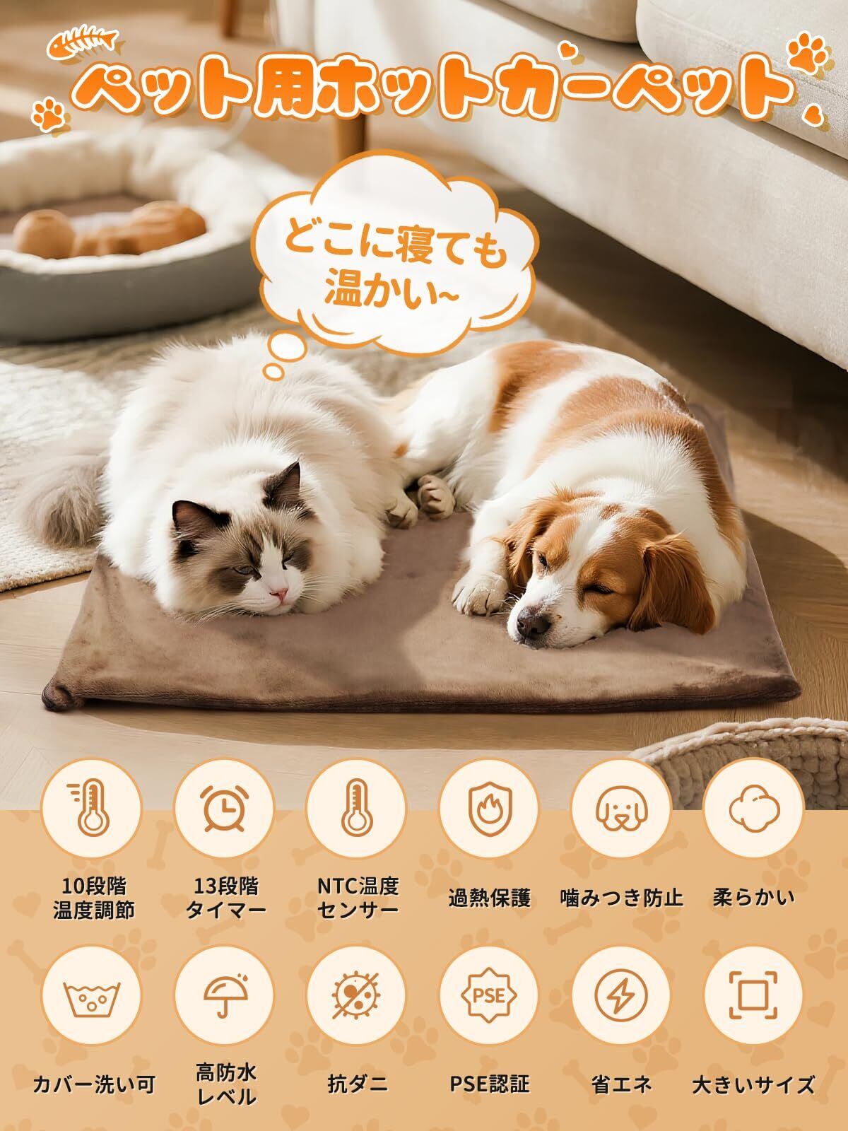 【省エネ・PSE認証済み】冬の暖房の最適肢。従来のペットこたつと比べて、驚きの省エネ効果を実現!(平均消費電力はわずか1時間あたり約0.8円!)ずっとつけっぱなしでも、電気代をあまり気にしないで!また、環境にも優しいデザインです。さらに、このペット用ホットカーペットはPSE認証を取得しており、12ヶ月のが付いていますので、安心してお買い求めいただけます。この冬、愛する家族に温もりをたっぷりと。
