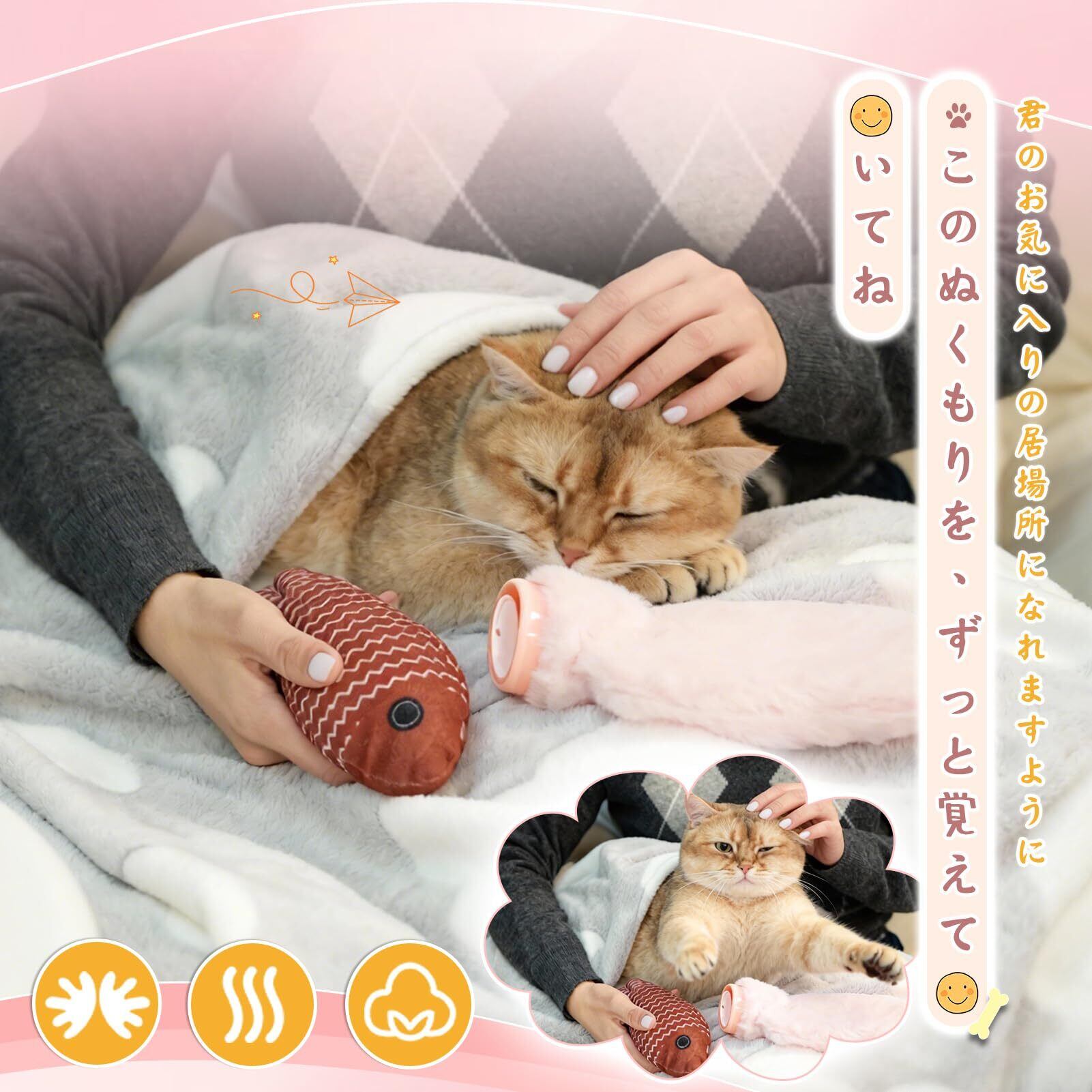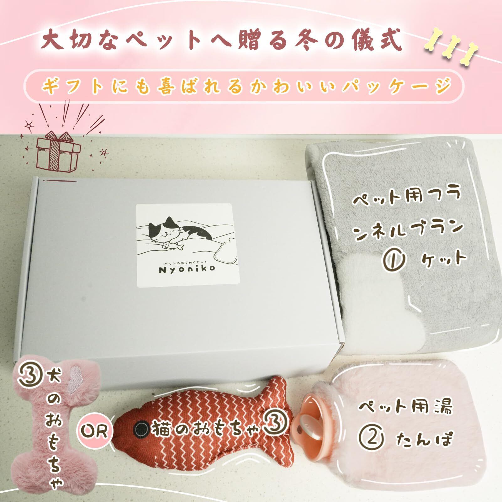【高品質 × 安全性|こだわり满載】 【極上の毛布】:肌触りが最高のフランネル生地を採用。やさしい風合いでありながら、抜群の保温性を実現。無染色、縮みにくい特性で、抜け毛や色落ちの心配がなく、丈夫な縁取りで長くご使用いただけます。 【安心の湯たんぽ】:6時間以上の保温性能で朝までポカポカ。漏水・耐圧・耐噛み設計で、万が一のペットのイタズラからも安心。保温カバーは 着脱可能で、清潔を保ちやすいのも魅力です。 【楽しさいっぱいのおもちゃ】:犬用はかわいい音で好奇心を刺激。猫用は魚型でカタニップ入り、夢中になって遊びます。どちらも柔らかい素材を使用し、抜け毛・色落ちがほとんどなく、ペットが噛んでも簡単に破れない 耐久性に優れています。