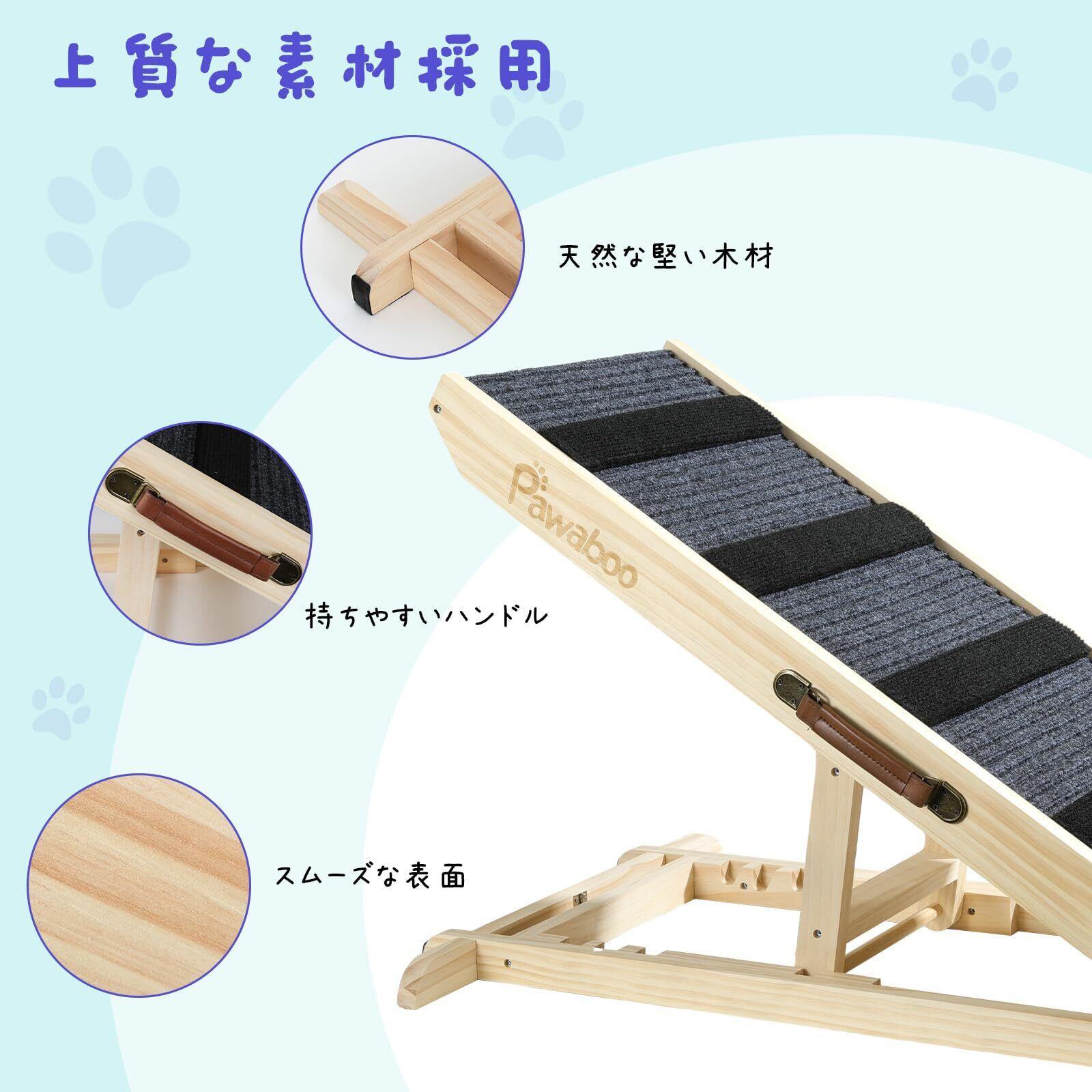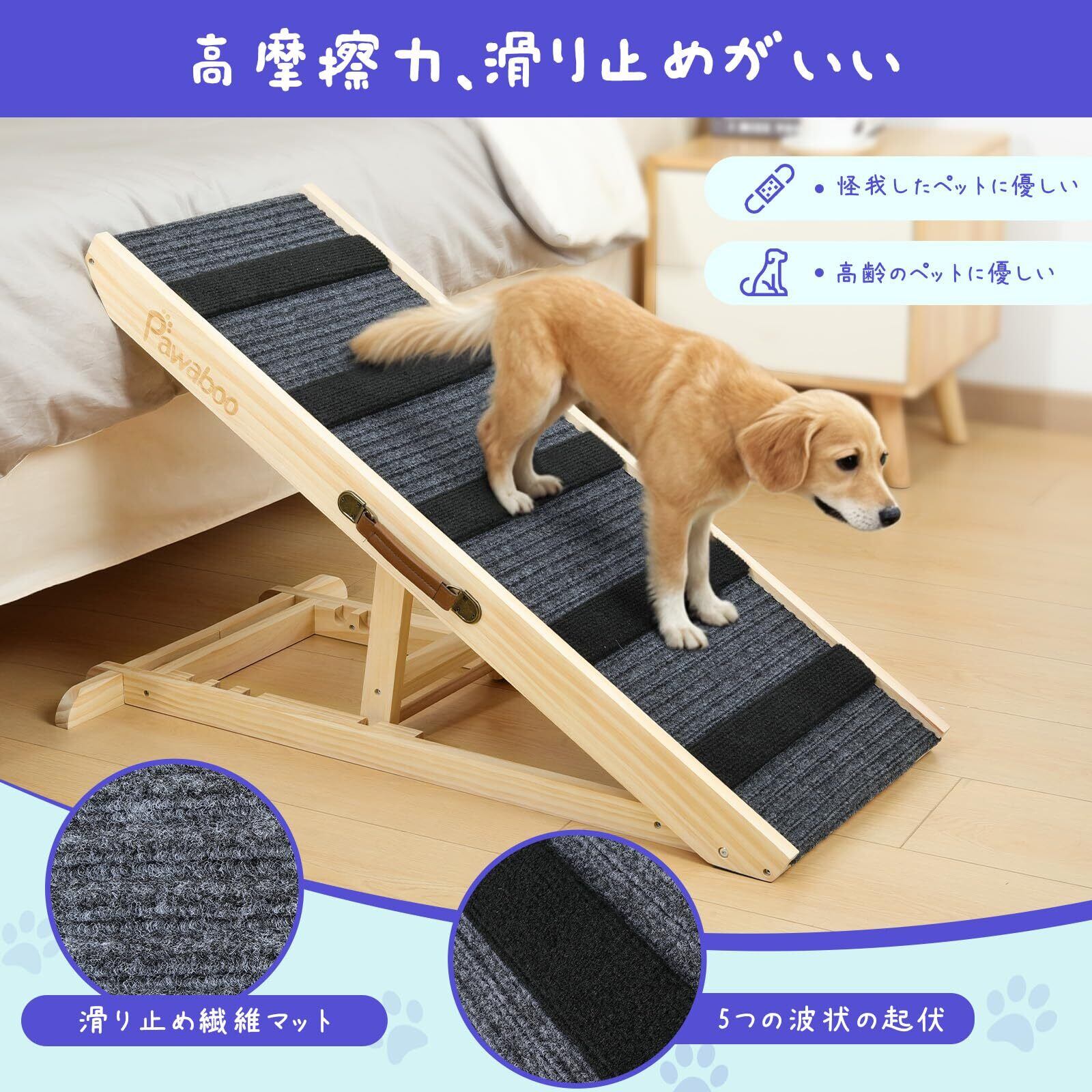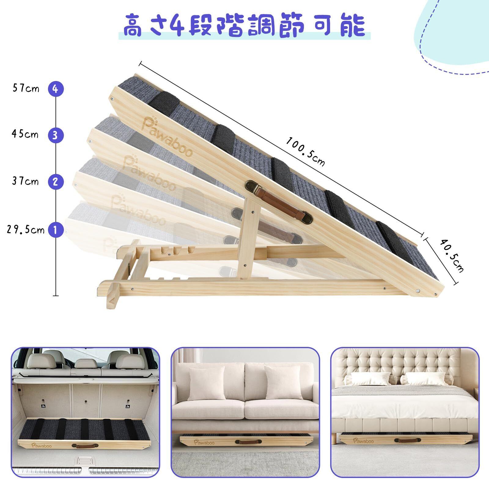 ペットスロープ 高さ57cm ペットステップ 4段調節 Pawaboo 小型犬用 中型犬用 大型犬用 坂状 高さ調節可能 段差がない 安定 滑り止め 木製 ステップ 幅40cm 省スペース 持ち運びやすい 組立簡単 子犬 老犬 ペット介護用 足腰の負担を軽減